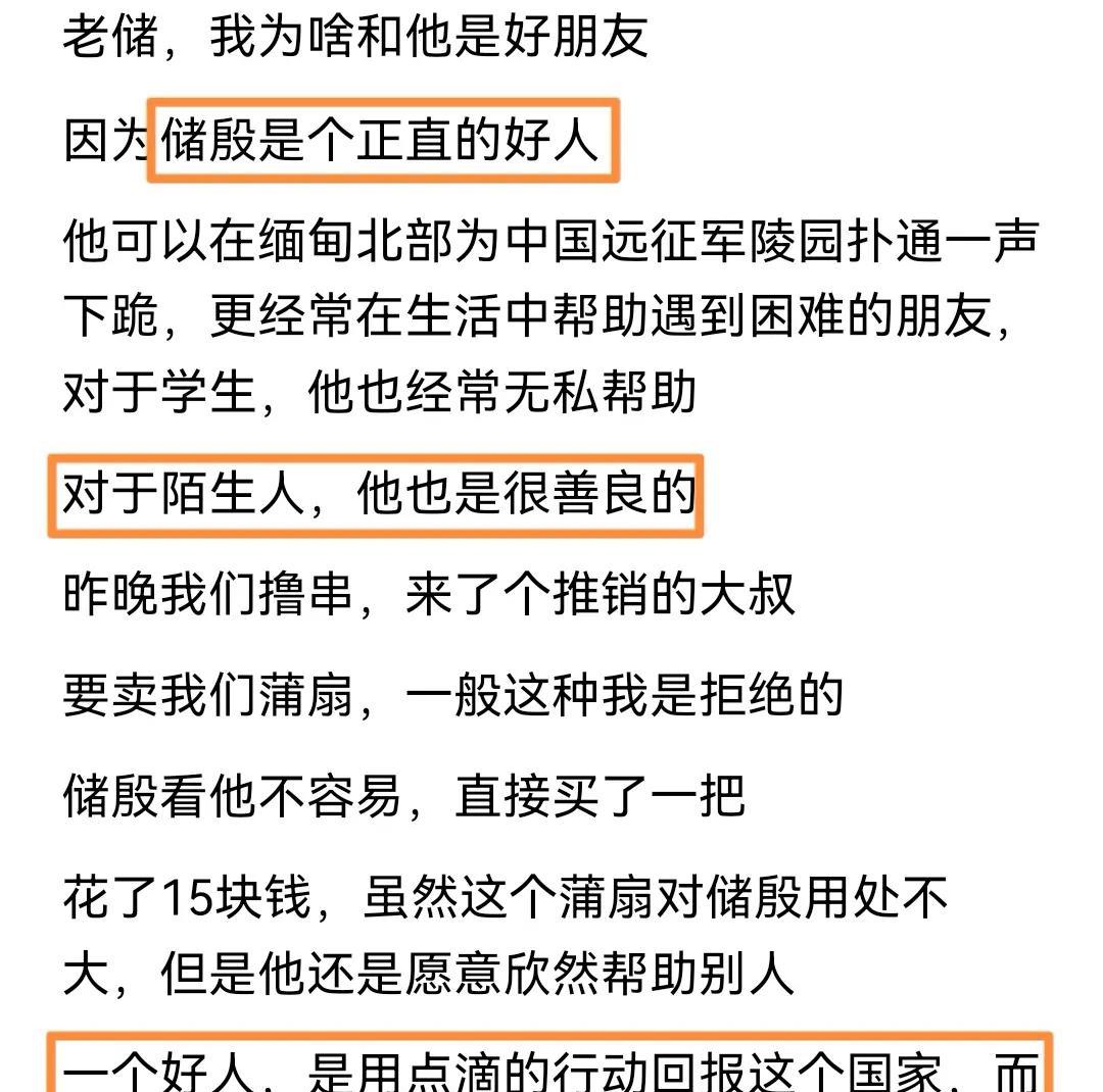 非常认同黄教授对储殷的评价——“是正直的好人”! 储教授“用点滴的行动回报这个国家,而不是靠喊口号。” 跪拜英烈!对推销蒲扇的陌生大叔,尽管不需要,还是买了一把,给予生活在底层人的一种默默帮助。 储教授确实是一位正直的好人!#储殷#