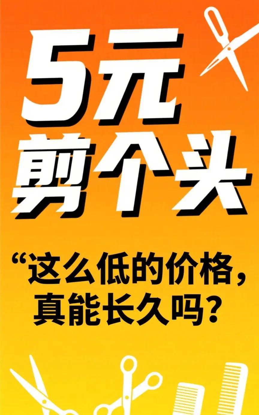 5元剪个头,这么低的价格,能长久吗? 如今,理发店倒闭潮来临了!我们小区门口原来有几家理发店,高低价格都有,但最低的也是10元,还是70岁以上老人或者儿童,就是管剪发,不给洗。 这不,前几天小区附近大超市开业了,有家快剪店居然就5元钱。如果在公园里搭个棚子5元钱能理解,毕竟,没有成本。在超市里,5块钱剪个头,老板能挣着钱吗?怕是手剪酸了,饭钱都凑不齐吧! 看来,理发店一家家关闭,原来都栽在了“价格战”。现实残酷,不知有多少行业都在这么“卷”。看似消费者占了便宜,可价格低到离谱,服务能有保障吗?店家撑不下去,最后吃亏的是谁?