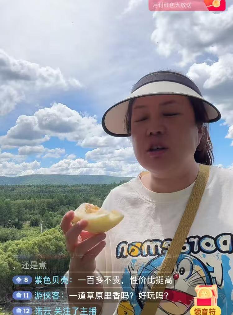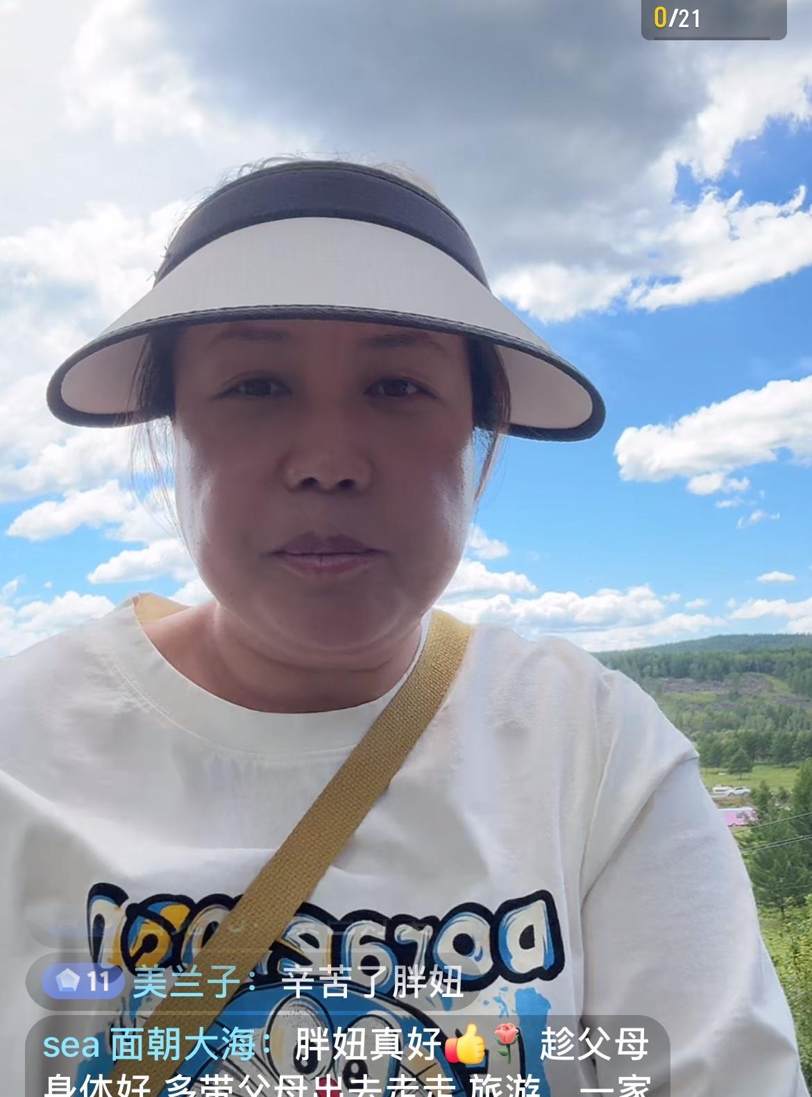 8月9日,胖妞出现在直播间,胖妞带着爸爸妈妈自驾游内蒙古了,胖妞说:住民宿不贵,就是吃饭贵!天天吃羊肉!妈妈说:自驾游就得车好,车不好害怕!胖妞说:赶快换车吧,可是换不了!妈妈说:是啊,车不行,害怕!胖妞解释说:因为有的公路没有护栏! 胖妞说:其实这个地方奔海拉尔四个小时,不过不行,我们得先去我大姑家,这时候碰到了旅游的姐姐,东北老乡,还一起合影留念了。胖妞说:这边香瓜特别好吃,特别甜!网友说:能不能拍?胖妞说:可是拍不了! 有网友问:胖妞,你父母多大岁数了?胖妞告诉网友:父母69岁了!父母也是享胖妞的福气了,趁着身体好的时候多溜达溜达!胖妞碰到了武汉的网友,一家人来了14口人,武汉网友告诉胖妞和父母,自己买羊肉做着吃便宜多了! 内蒙古阿尔山,这边风景秀丽,空气肯定非常清新,胖妞美了!