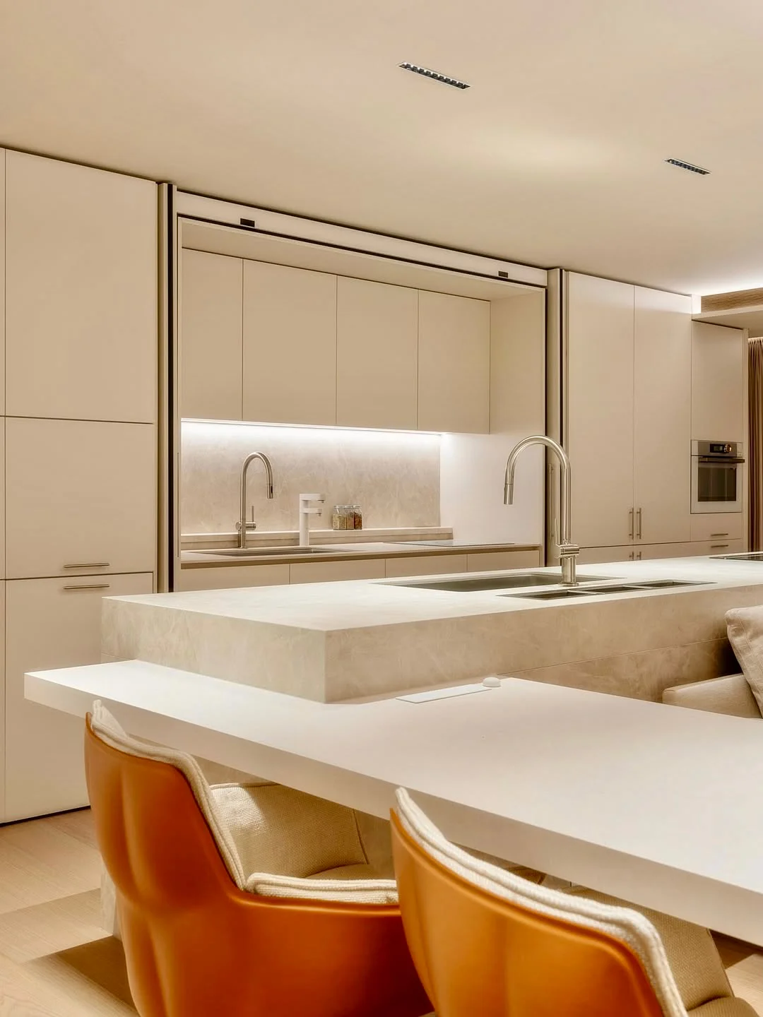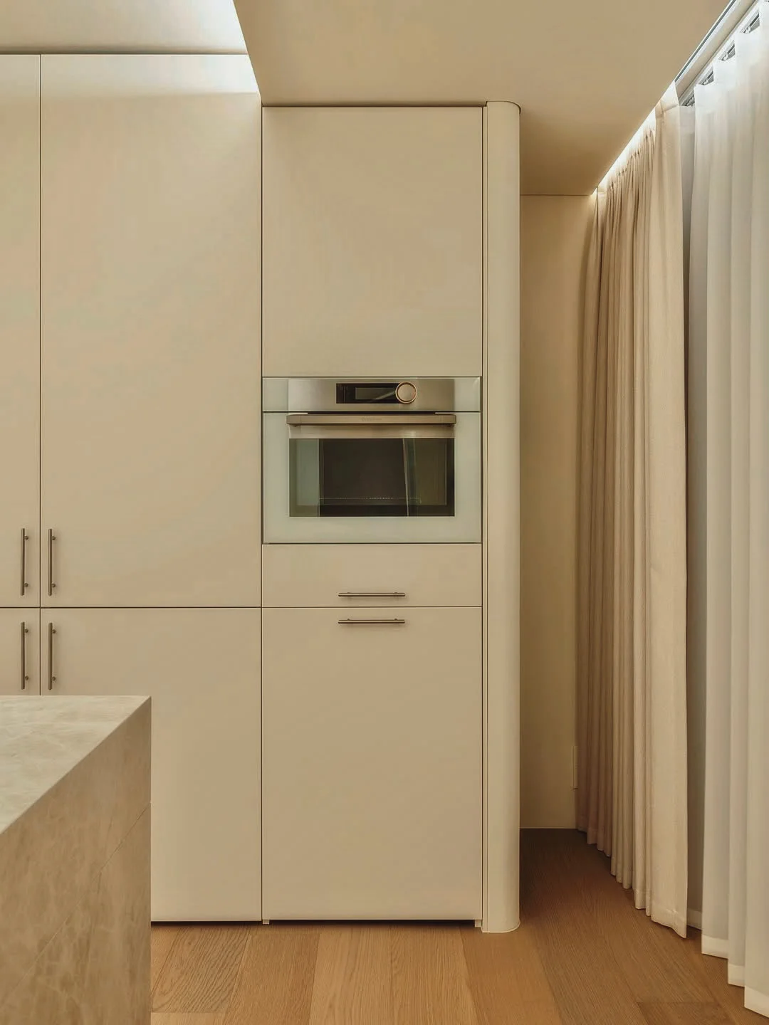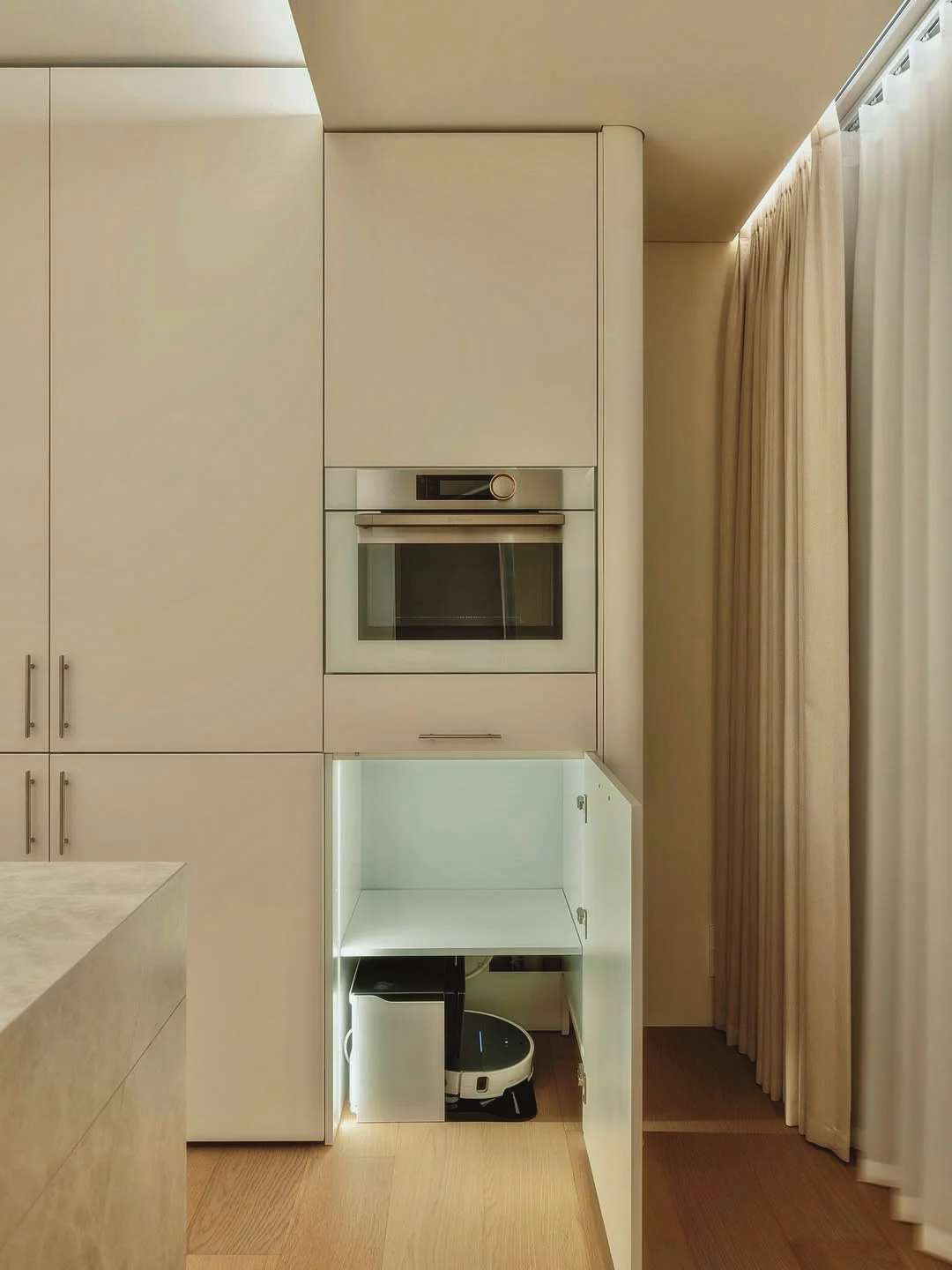 嵌入式电器+下拉式隐藏柜是标配!烤箱/扫地机器人/垃圾桶全藏进柜体,柜门采用「无拉手按压式开启」,立面干净到能当镜子照✨