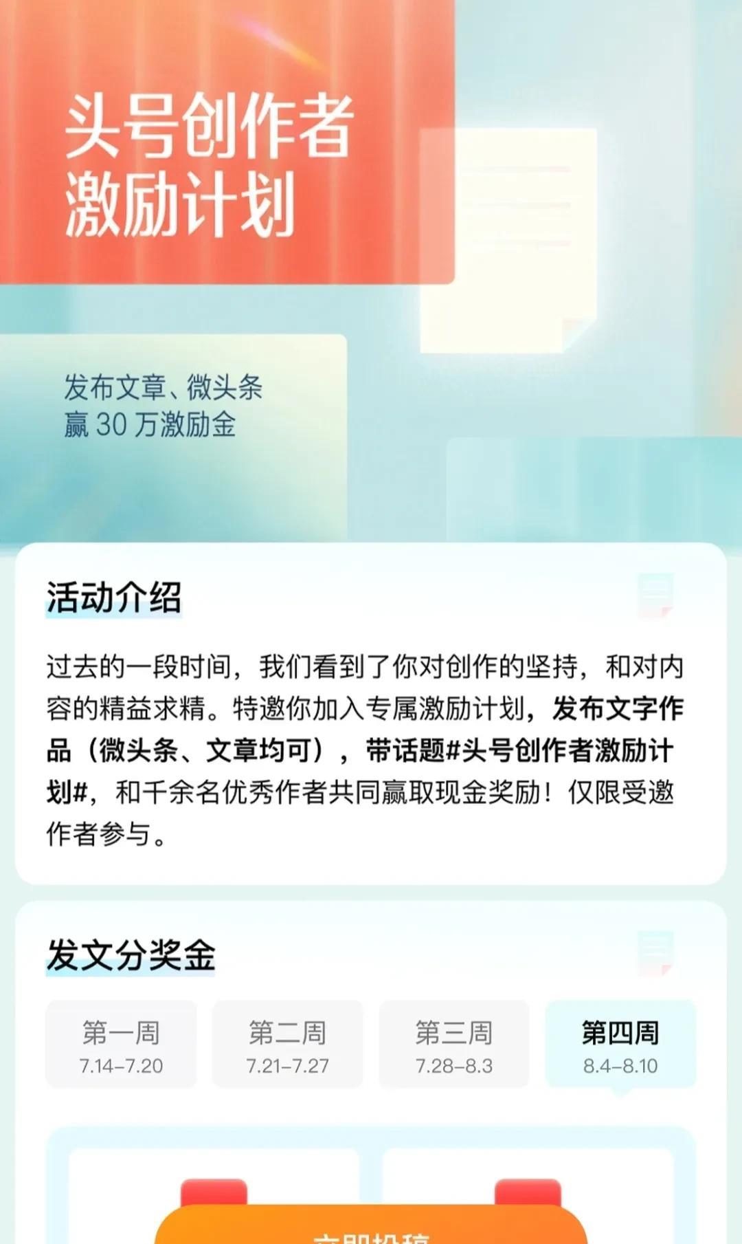 最近看到好多网友都在参加”头号创作者 参加”头号创作者激励计划”的窗口,点进 去一看可以发文参加该活动。 创作者激励计划”进行投稿发文是否可以 有知道具体参与情况的友友是否可以告 知一下,这样参加活动发文有效吗?