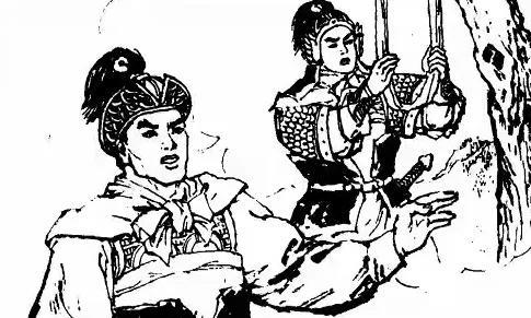 两位寨主来到后院找到妹妹穆桂英,说后山树林里有一位十八九岁的漂亮小伙上了吊,他的