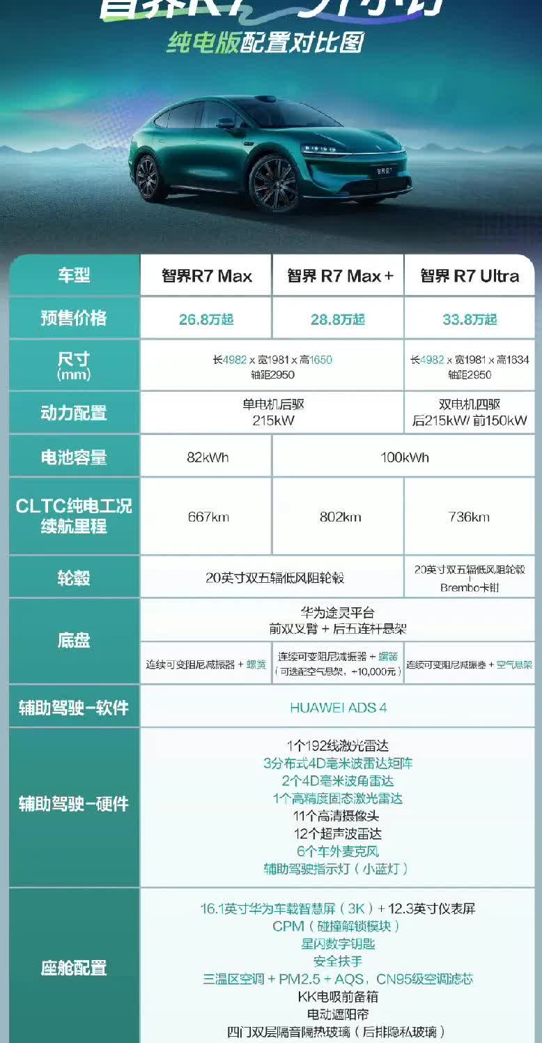 智界新款R7正式开启预售,26.8万起 全系标配激光雷达! 对于客户来说,最低配没必要买啊,直接MAX+(中配)性价比最高! 28.8万的MAX+,空悬变成1万选装,但是标配100度电池和零重力座椅、ADS4硬件!