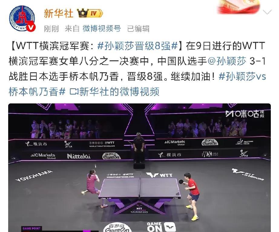 孙颖莎一扫阴霾, 强势拆了桥本, 央妈第一时间发文祝贺, 央妈也坚信莎莎有实力有能力, 战胜日本疯狂削球手。 央妈@孙颖莎, 夸赞莎莎连扳三局晋级8强, 同时也鼓励莎莎继续加油! 莎莎只用了一局, 就摸透了桥本的旋转规律, 特别是第四局打的桥本11-1, 桥本直接崩溃, 不仅央妈偏爱莎莎, 我们也爱死你了莎莎! #我的宝藏兴趣#