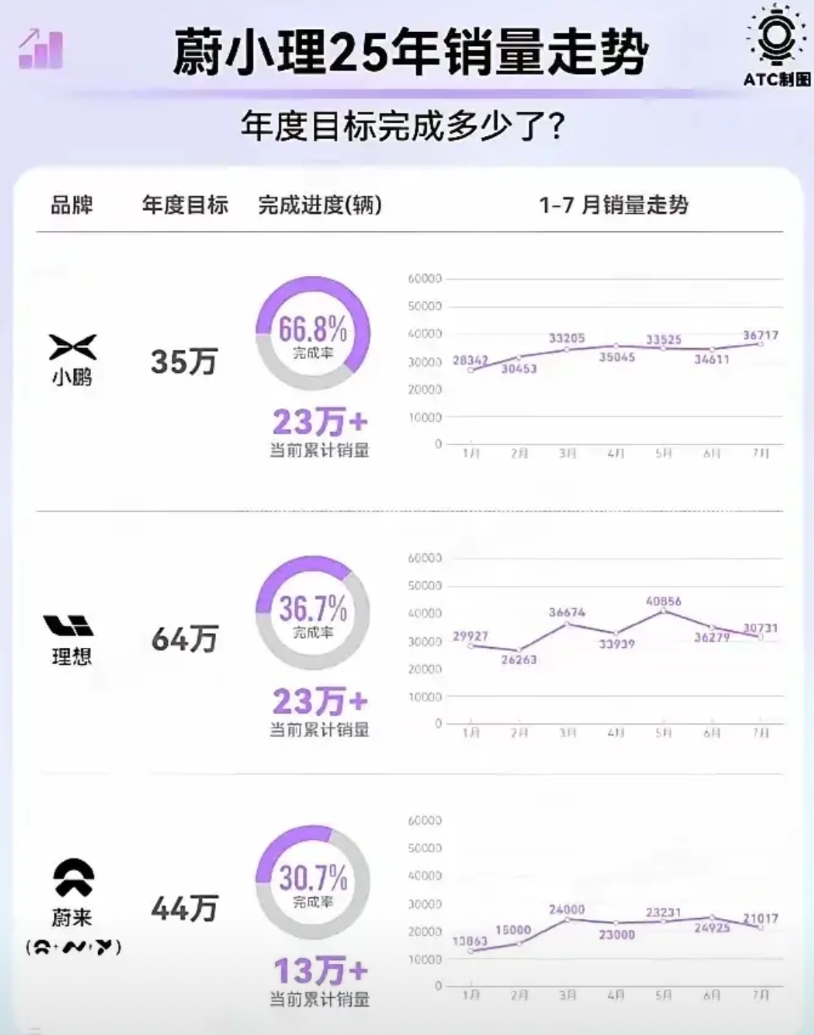蔚小理今年展现出了差异化的发展态势,小鹏最强势,连续9个月销量破3万,爆款产品一
