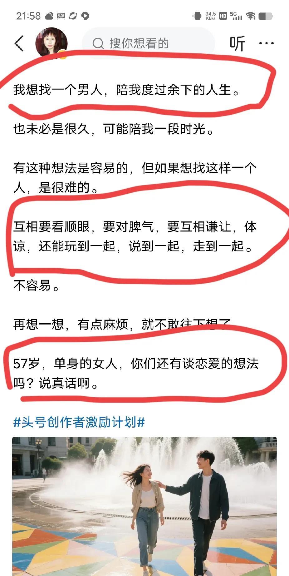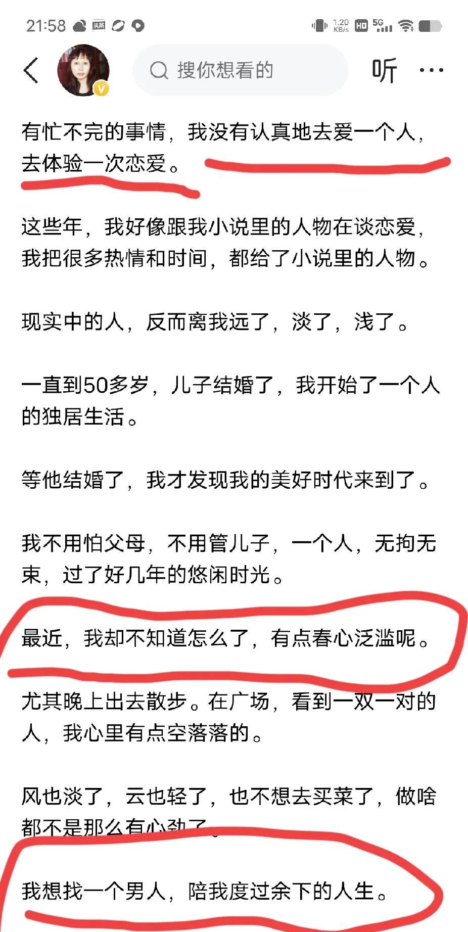 素老三想谈恋爱了 谁敢来追求她 刚刚刷到我三姐的文章,她说想找一个男人来陪她,都57了,不想去浪费这美好的时光! 出去逛街看到别人出双入对的,觉得心里空空的 最近一段时间,发现自己春心荡漾,好想找一个男人来陪我度过余下的人生 三姐的要求不高,首先是看得对眼,互相包容理解体谅,脾气要对互相谦让,要能聊得在一起,玩得在一起 这算不算三姐在公开征婚呢? 有符合这种条件的男人吗?大胆的站出来,三姐这么好的条件,你不来抓住你就是笨! 我们全体粉丝绝对会举双手赞成三姐找姐夫,我认为三姐还有最重要的一点没说,就是要全力支持三姐写作,假如为了谈恋爱把作品都断更了,那我们这些死忠粉怎么办? 总的说来,这绝对是一件大好事,希望广大的粉丝朋友们一起为三姐张罗张罗,说白了就是找一个懂三姐的男人来照顾三姐的饮食起居,三姐的目的就是事业爱情双丰收,大家懂这个意思吗?#素老三# #素老三文学# #素老三玩法# #素老三书单# #素老三推荐书单# #头号创作者激励计划#