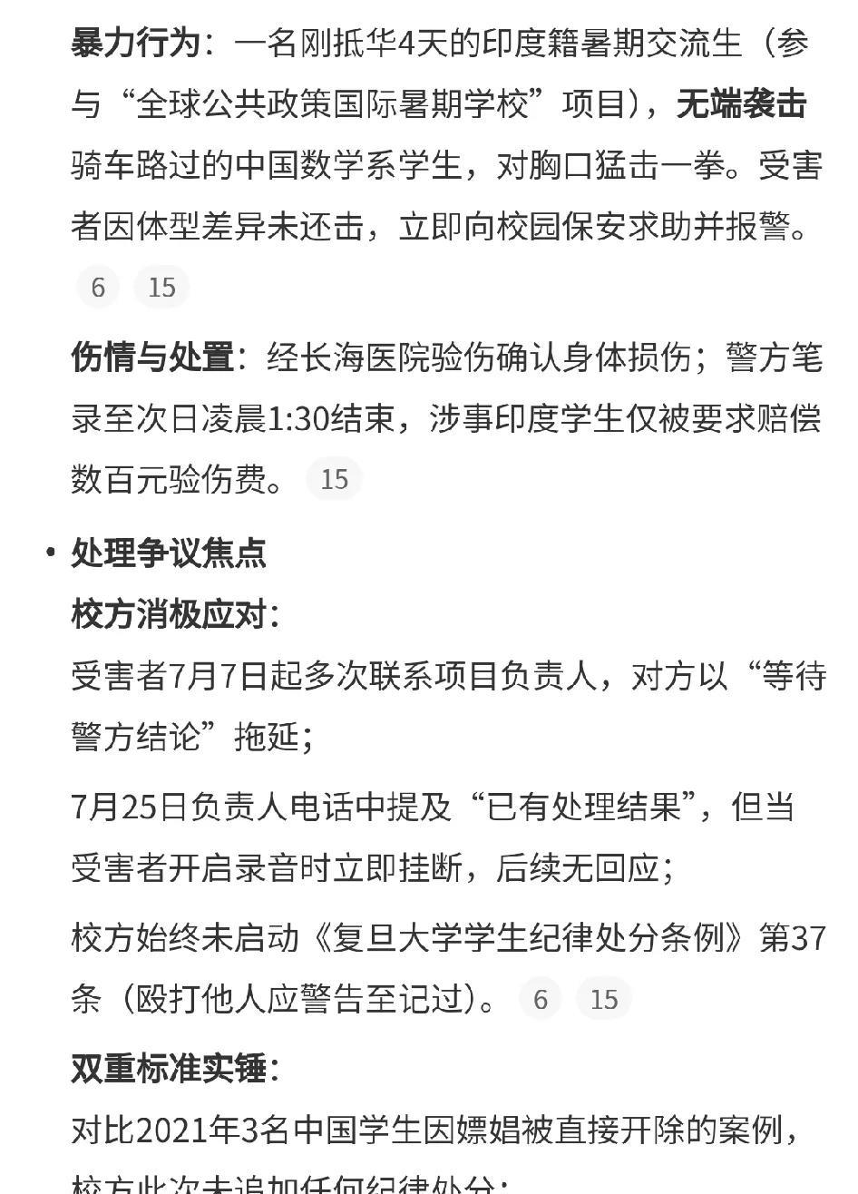 印度留学生刚到四天就打中国人,还被高校多次包庇! 就这个三哥,块头看起来很大。上个月七号到复旦大学邯郸校区作暑期交换生,第四天就打了素不相识的中国学生,监控证据确凿,验伤报告也做了,警察也受理了,却卡在学校不处理! 中国学生没有得到一句道歉,更没有一分钱赔偿,学校没有任何公平处置,直到留学生大大方方的回到印度,学校连个屁也没有。估计这个三哥回去之后还要跟他们的同胞吹牛——“我就随便打了一个中国人,他完全不是我的对手,中国功夫算个毛线,我没有受到任何惩罚,就连学校都帮我说话,就因为我是印度人”。 这跟驻日美军在日本犯罪了不会受到任何惩罚有什么区别,他们只是印度留学生而已,复旦怕什么呢? 我们可以包容外国友人,但是学校不能纵容留学生欺负中国人,自己的学生被老外在中国欺负了,确凿的证据比不上学校的脸面,这还是高校吗?