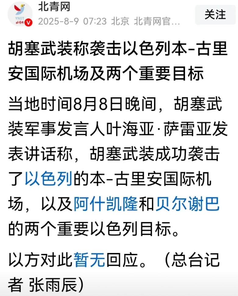 朋友们有没有发现?现在胡塞武装袭击以色列,西方媒体已经不报道了! 他们在强行压这个热点! 央视新闻报道称,当地时间8月8号,胡塞武装发言人叶海亚对媒体表示。 胡塞武装成功地袭击了以色列的本古利安国际机场以及另外两个重要的军事设施! 目前以色列方面没有任何的回应! 现在没有任何的回应,估计以后也不会有什么回应! 因为他们不知道怎么办好! 美国和以色列现在拿着胡塞武装真的是没辙了! 整个2025年,美国和以色列对胡塞武装的唯一胜仗,就是查扣了一艘伊朗送给胡塞武装的军火船! 这是以色列和美国唯一可以宣传的一次胜利了! 还是借的也门政府军的手,扣了一艘伊朗的货船! 里面有送给胡塞武装的一些武器装备! 这是全年唯一的亮点,这是全年以色列和美国唯一可以吹嘘的胜利! 然后就没了,什么都没有了! 剩下的就是被动挨打,一次又一次的袭击,然后以色列和美国一次又一次的闭嘴! 以色列和美国估计已经认命了,还是先搞伊朗吧,伊朗相对还简单一些!