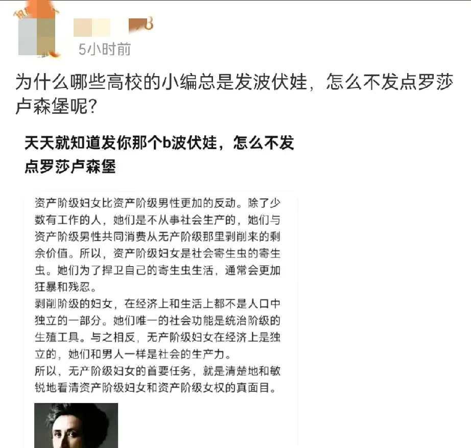 高校官微集体转发波伏娃言论,学生团队成争议焦点,罗莎名言为何被雪藏? 今天刷到新闻说好多大学官微突然齐刷刷发波伏娃的名言,说是为了声援那个被曝诬告他人的杨某。这让我有点懵,为啥突然集体搞这波操作?有个博主分析说,这些官微其实都是学生自己管的,而且大部分是新闻系女生。女生加新闻专业的组合,可能本身就偏向某些立场,所以在杨某事件这种敏感时候发声,感觉不是单纯支持,更像是故意找事。 我查了下,波伏娃那句“女人不是天生的,而是被塑造的”确实常被用来讨论女性独立,但用在杨某这事儿上总觉得别扭。反倒是另一个欧洲女权先驱罗莎·卢森堡的话没人提,她说过“自由就是能够活得像一个人”,这话说得更狠,但为啥没人敢发?是不是怕话说太满惹更大争议? 有报道说这些官微学生团队自己决定发什么,学校管得不严。结果这次集体发波伏娃,被批“站队明显”。我认识一个新闻系学生,她说他们平时发消息前会看网上热点,啥火发啥,但像杨某这种争议人物,学生可能只顾刷存在感,根本不考虑后果。 现在网上骂声不少,说这些官微不该掺和敏感事件,尤其是拿名人名言当工具。但问题在于,学生团队到底该多大程度代表学校?如果他们发的东西和学校价值观不符,最后背锅的还是学校。以后高校得想想,到底是让学生自由发挥,还是管得严点避免翻车。 这事儿让我想到,很多学校可能都没意识到官微运营的风险。学生想表现可以理解,但动不动就卷入舆论战,最后受伤的是学校声誉。要是下次再碰上这种事,学校得多把把关,别让几个学生一句话搞砸整个学校形象。