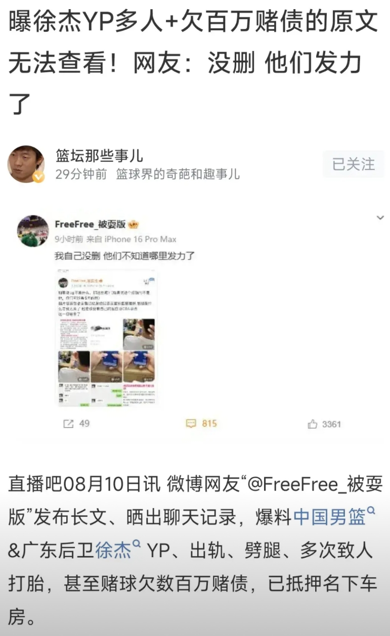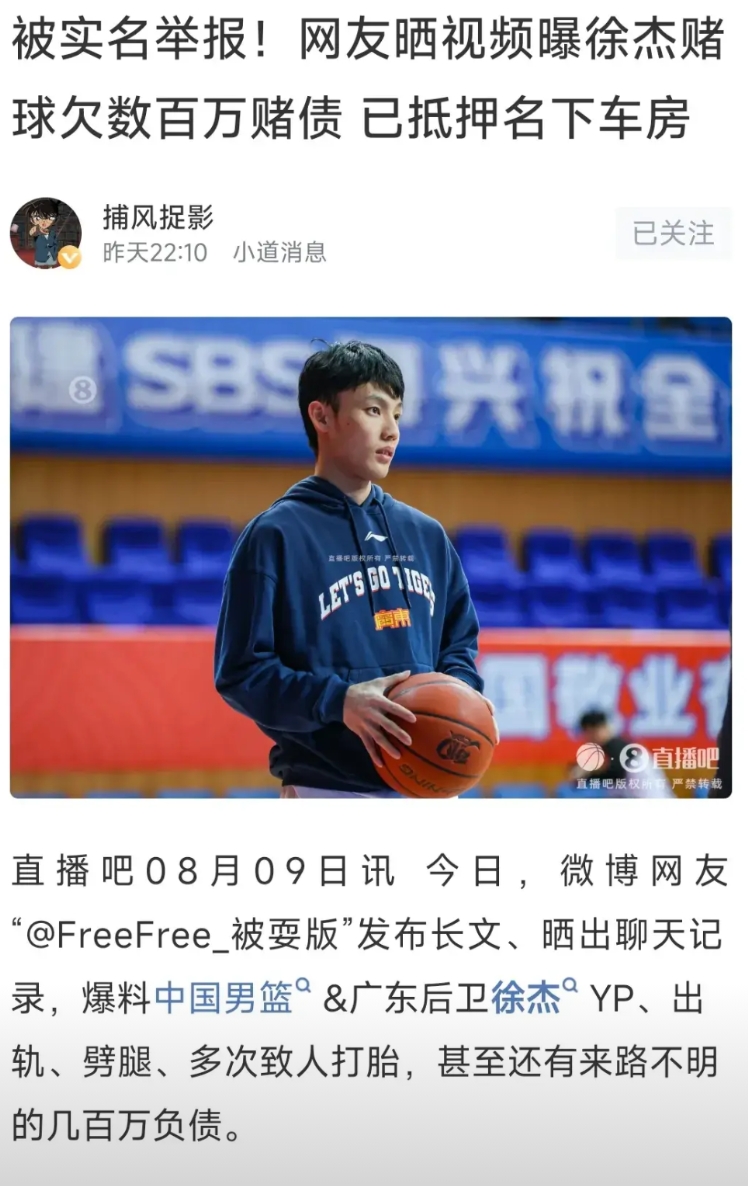 徐杰好糊涂啊,恕我直言!媒体持续跟进报道徐杰!没落实的事就报道,媒体太不负责任了吧,万一冤枉了徐杰呢,既然事情开始发酵,登上微博热搜前三,相信篮协会重视的,起码经过调查还给球迷和徐杰一个清白!徐杰这事让我想起了曾繁日,阿日当初可是一年没打球,还有冯欣,发现一件有趣的事,胡明轩徐杰在国家队很少同框
