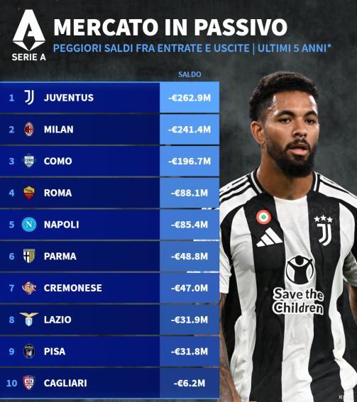 意甲五季转会账本:豪门承压黑马盈利 过去五年,意甲俱乐部在转会市场的收支平衡呈现复杂态势,整体累计净亏损近 3.5 亿欧元,凸显多数球队在投资与收益间的结构性失衡。 亚特兰大以 1.196 亿欧元的净收入高居意甲转会盈利榜首位,成为理性运营的典范。维罗纳(1.09 亿欧元)和萨索洛(1.02 亿欧元)紧随其后,乌迪内斯(9950 万欧元)也跻身盈利前列,这些中游球队凭借高效的球员培养与出售策略实现正向循环。 传统豪门中,国际米兰是唯一五季累计盈利的球队,净收入达 7690 万欧元,但近期颓势明显 —— 上赛季净亏损 5980 万欧元,本赛季夏窗至今再亏 4130 万欧元,老将高薪与位置重叠问题导致球员出售困难。 尤文图斯则深陷泥潭,以 2.629 亿欧元的净亏损成为意甲最 “烧钱” 的俱乐部,经济困境让弗拉霍维奇的高薪合同成为沉重负担,严重制约球队转型。AC 米兰净亏损 2.414 亿欧元,高价引援未获相应回报加剧了财务压力。 升班马科莫的情况尤为特殊,虽刚升入意甲却已累计亏损 1.967 亿欧元,远超罗马(8810 万欧元)等球队,其巨额投入依赖老板资金支持,短期内难见财务回报。 那不勒斯虽五季净亏 8540 万欧元,但凭借近三年两夺意甲冠军的成绩稍显平衡,本赛季夏窗更实现 1320 万欧元净收入。