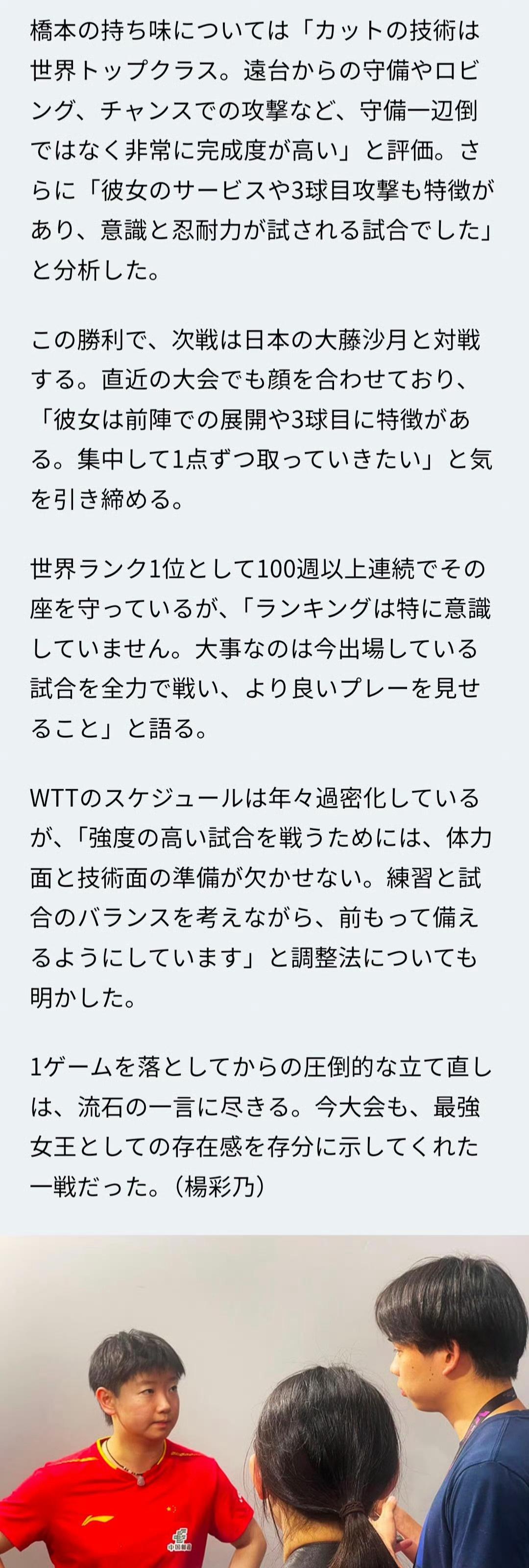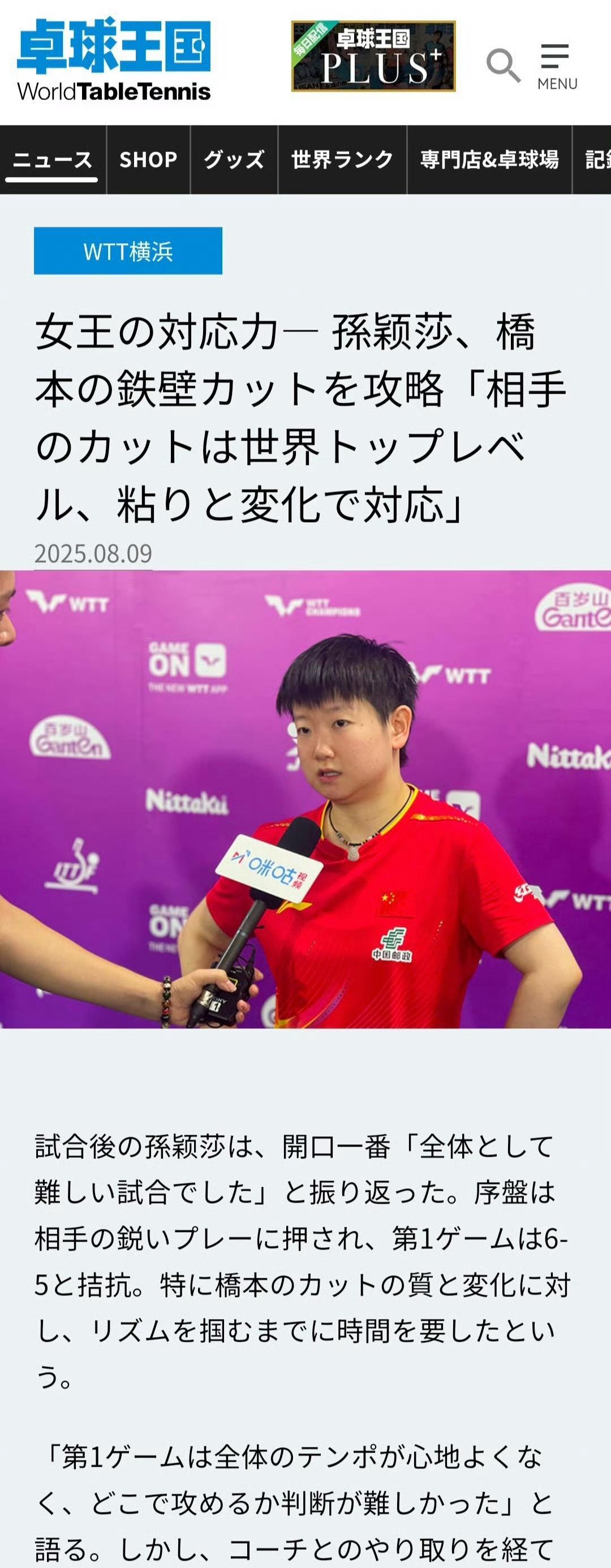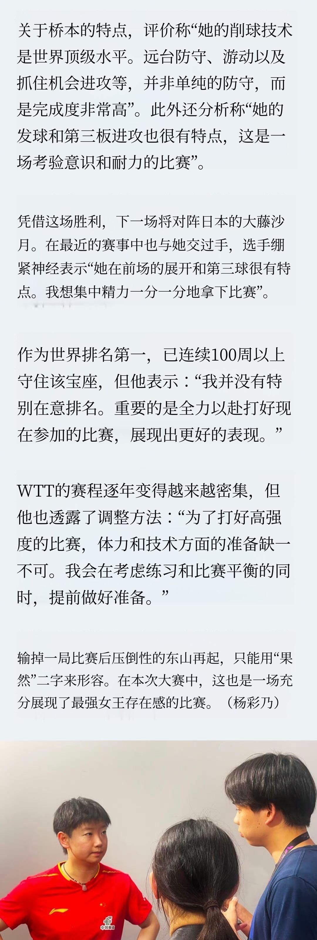 女王级应变能力——孙颖莎化解桥本无解的削球:“对手的削球世界一流,但我用韧性和变化来应对” cr.桌球王国