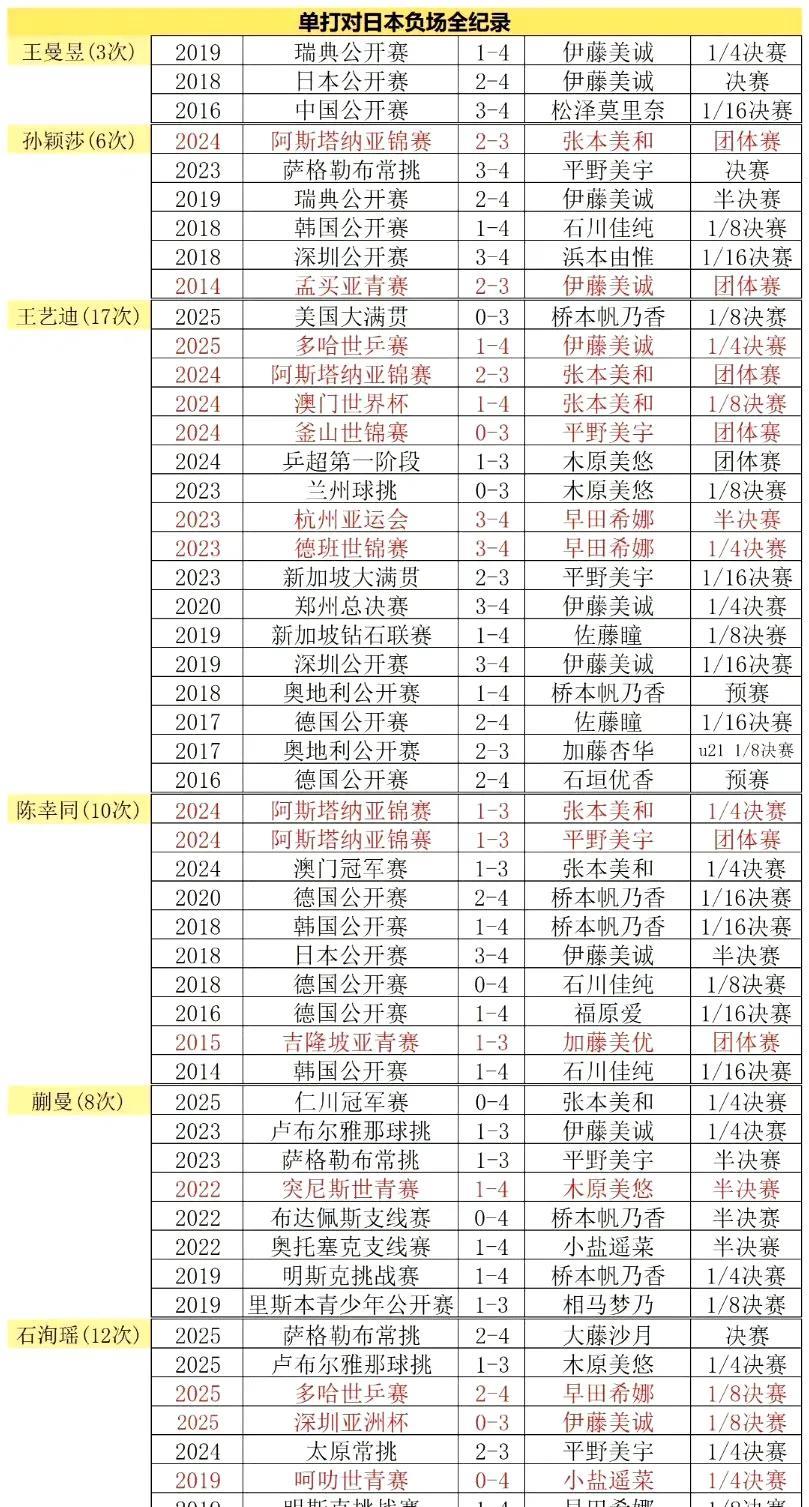 王艺迪虽然wtt单打100场胜利了,却有一个很扎心的事实。 王艺迪应该是现役国乒输日本队最多的主力,达到了17次,尤其是不少重要比赛都输日本,比如亚锦赛和世界杯输张本美和,亚运会和世锦赛输早田希娜,世乒赛输伊藤美诚。王艺迪确实被人诟病输遍了日本主力,但是100场女单胜利也是了不起的成绩。 另外石洵瑶输日本队12次,陈幸同10次,蒯曼8次,要想成为孙颖莎、王曼昱那样的绝对主力,还是要多胜几个日本主力!