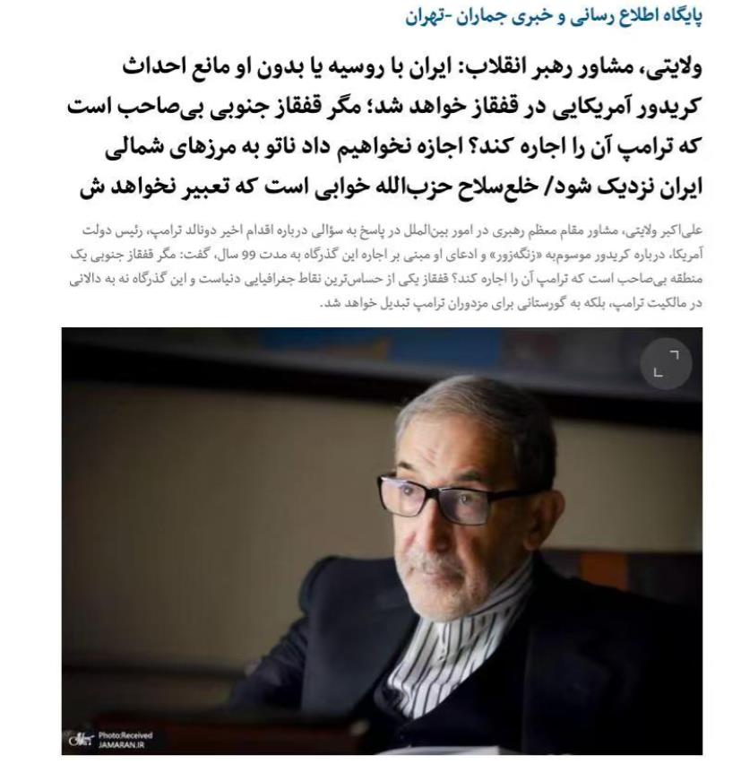 美国,阿塞拜疆,亚美尼亚已经达成桑格苏尔走廊计划。伊朗最高领袖顾问阿里·阿克巴尔·维拉亚蒂表示,强烈反对,建设桑格苏尔走廊,因为,美国和土耳其军队将会出现在伊朗边境。