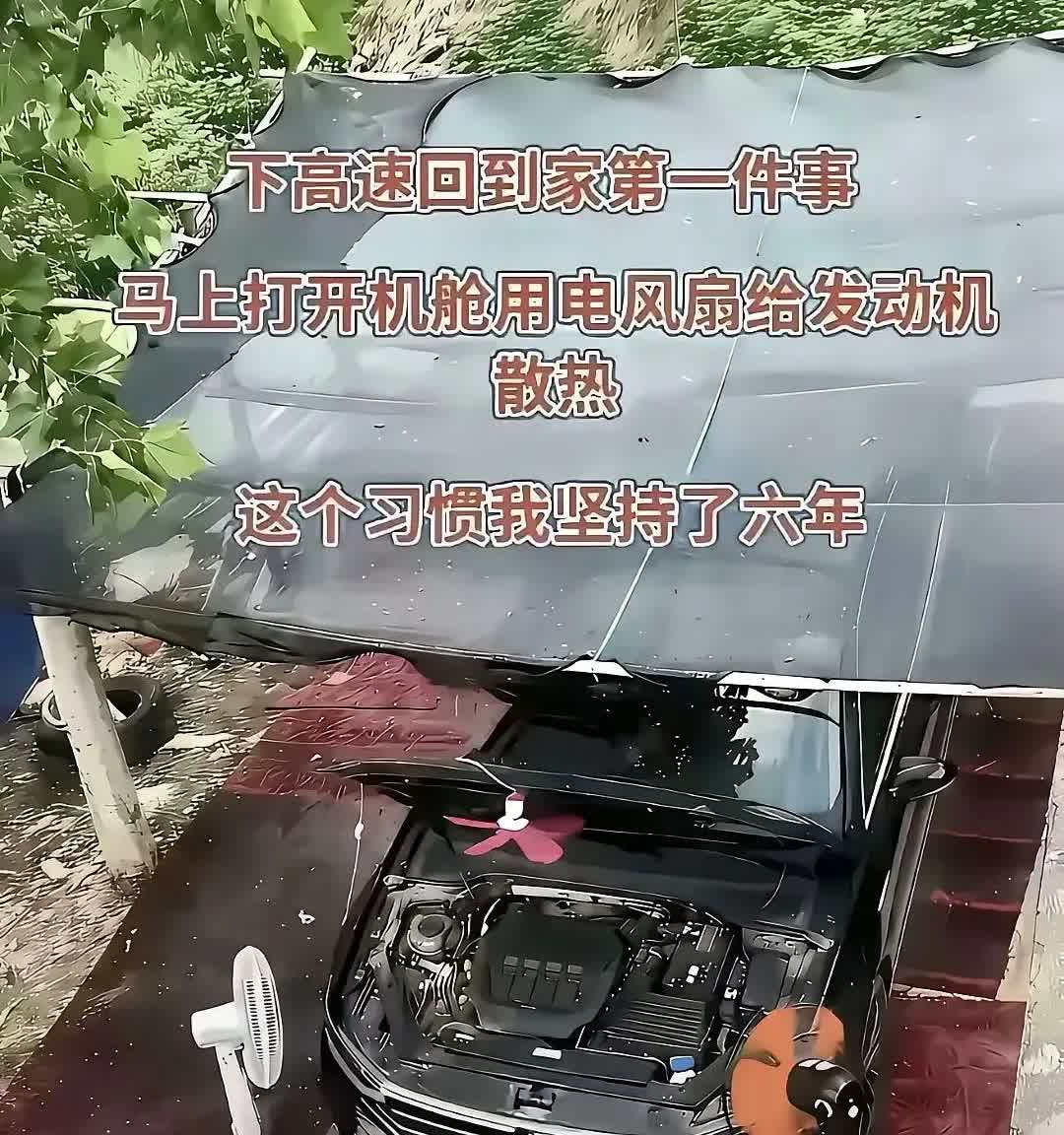 这停下来就吹风扇降温,搞不好车子很容易感冒的,下次要开车记得把车背背上,这样车子就没事了