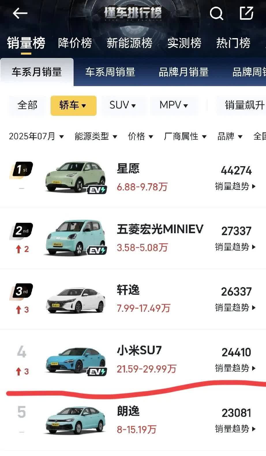 雷军没有吹牛, 8月1日雷军说,2025年7月小米汽车交付量超过30000台。 今天7月份的汽车销量数据出来了, 小米SU7的7月份销量是24410台, 小米YU7的7月份销量是6042台, 小米SU7+小米YU7总共是30452台,超过了3万台, 小米汽车超级工厂每76秒钟,就有一台新能源汽车下线,这个月小米汽车的交付量估计会增长。 你们觉得呢?