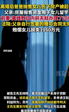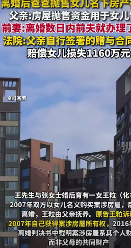 北京,一男子婚后给女儿买了套房,9年后,他跟妻子离婚,离婚没几天,他就背着女儿,把女儿名下的房子赠予并过户给自己,然后悄悄给卖了,女儿愤怒的把男子告上法庭,要求男子赔偿自己1160万元损失,法院的判决让男子顿时傻了眼。 据红星新闻8月7日发布,一个姑娘把自己亲爹告上了法庭,索赔 1160 万!这事儿还得从十几年前说起。 2007 年的时候,王先生(化名)和张女士(化名)两口子,感情甜蜜,俩人就一个女儿,夫妻俩手里也有点积蓄,就想着给女儿小王(化名)留点保障,就用女儿的名义买了套房。那时候,小家庭和和美美,谁也没想到后来会走到离婚这一步。 日子过得挺快,转眼到了 2016 年,王先生和张女士因为家庭琐事和三观意见不统一,导致夫妻俩感情没了,最终走向离婚。 按理说,离婚就好聚好散,可没想到,王先生在离婚没几天,就干了件让人愤怒的事儿他把女儿名下那套房子,通过签赠予合同的方式,过户到自己名下了,完了还悄悄把房子给卖了! 这一系列操作,连前妻张女士都没想到,更别提当事人女儿小王了。小王知道这事儿的时候,整个人都懵了。自己名下的房子,怎么突然就没了?一打听,才知道是亲爹干的。愤怒的她,直接把父亲告上了法庭,要求赔偿损失 1160 万。 法庭上,王先生倒是有说辞。他说过户房子是为了贷款,贷的钱都给女儿留学用了,是为女儿好。可前妻张女士不干了,说刚离婚没几天,前夫就急着过户,这里面肯定有猫腻。 法院一查,发现王先生自己签的那个赠予合同,根本就不合法。作为监护人,他处置未成年人名下的房产,得为孩子的利益着想,而且得有合法的手续。 可他这倒好,私自过户又变卖,明显损害了女儿的权益。所以法院判了,王先生签的赠予合同无效,得赔偿女儿 1160 万的损失。这结果一出来,王先生傻了眼,估计也没想到事儿会闹这么大。 宣判后,王先生不服气,然后提起上诉,二审法院维持原判,该判决现已生效。 这事儿在网上一传开,网友们都炸开了锅。有人说:“当爹的怎么能这么干,自己孩子的权益都不顾,太让人寒心了。” 还有人感慨:“不管夫妻感情咋样,孩子的利益不能这么随便被牺牲,当监护人的得守好本分。” 也 有人从法律角度说:“这事儿给所有家长提了醒,别以为孩子小,就能随便动他们名下的财产,法律可不答应。” 说白了,这事儿就是给所有家长敲了个警钟。孩子名下的财产,那是法律赋予他们的保障,不是家长想动就能动的。就算是为了孩子好,也得走合法的程序,得让孩子明明白白,得经得起法律的考量。否则,像王先生这样,最后赔了钱又伤了孩子的心,得不偿失。 对此你怎么看?欢迎大家在评论区留言讨论。