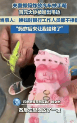“这下后悔了吧!”湖南永州,一夫妻抓了只蚂蚱,随手放在了汽车的扶手箱里,结果下车时,忘记带回家了,蚂蚱在车上逗留了一夜,男子想起来,准备拿回家时,发现对方竟然把百元大钞啃食了,而妻子接下来的举动,让人意外,网友:蚂蚱也知道钱是好东西!
