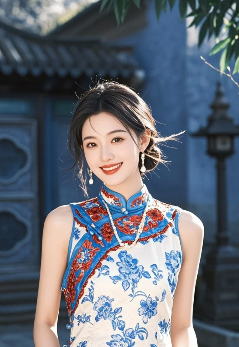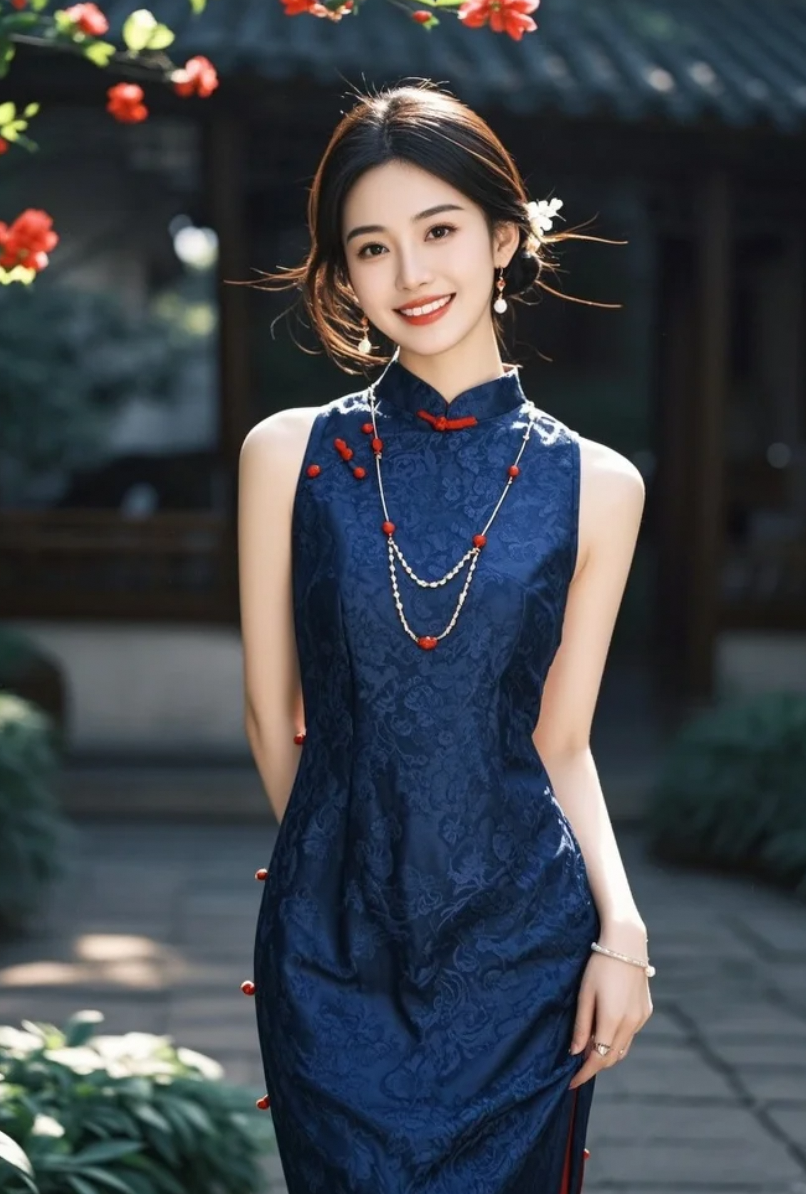 一条丝缎蓝旗袍,一条高定珠宝链,她把优雅穿在了身上