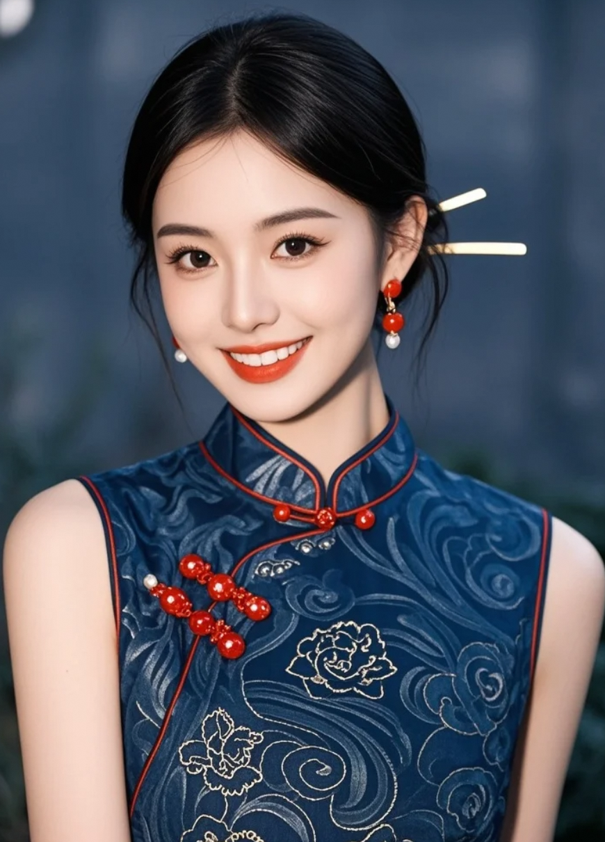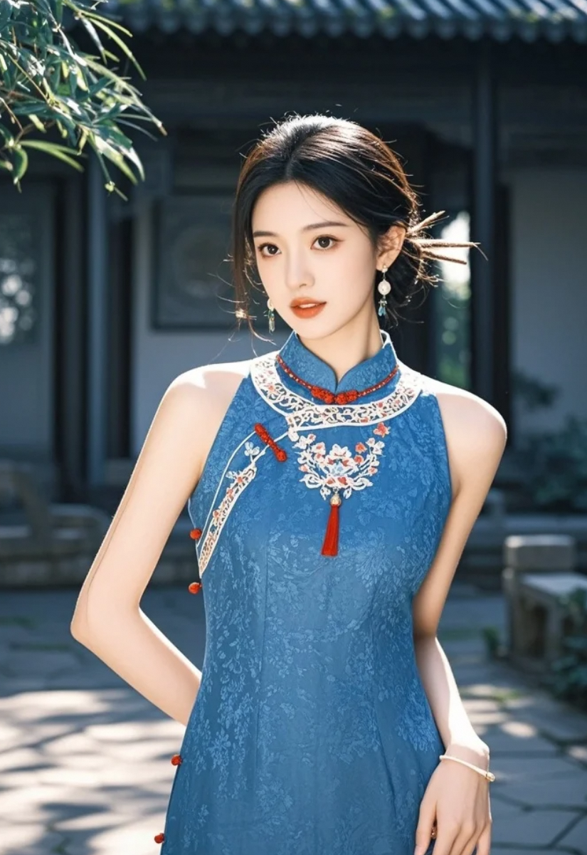 她站在老宅庭院里,穿蓝色露肩旗袍,美得让人不敢大声呼吸