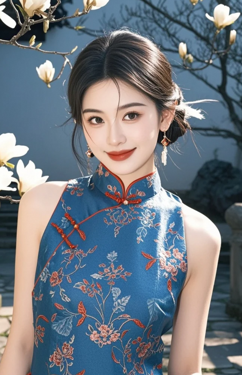 她穿一袭静谧蓝旗袍立于庭院,仿佛把整个东方的月色穿在了身上