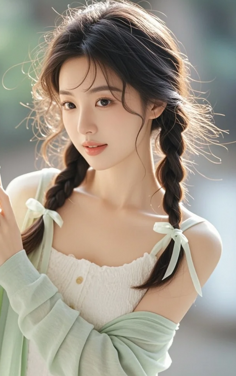 麻花辫+丝带尾梢,她靠在窗边的样子,像极了青春电影的开场