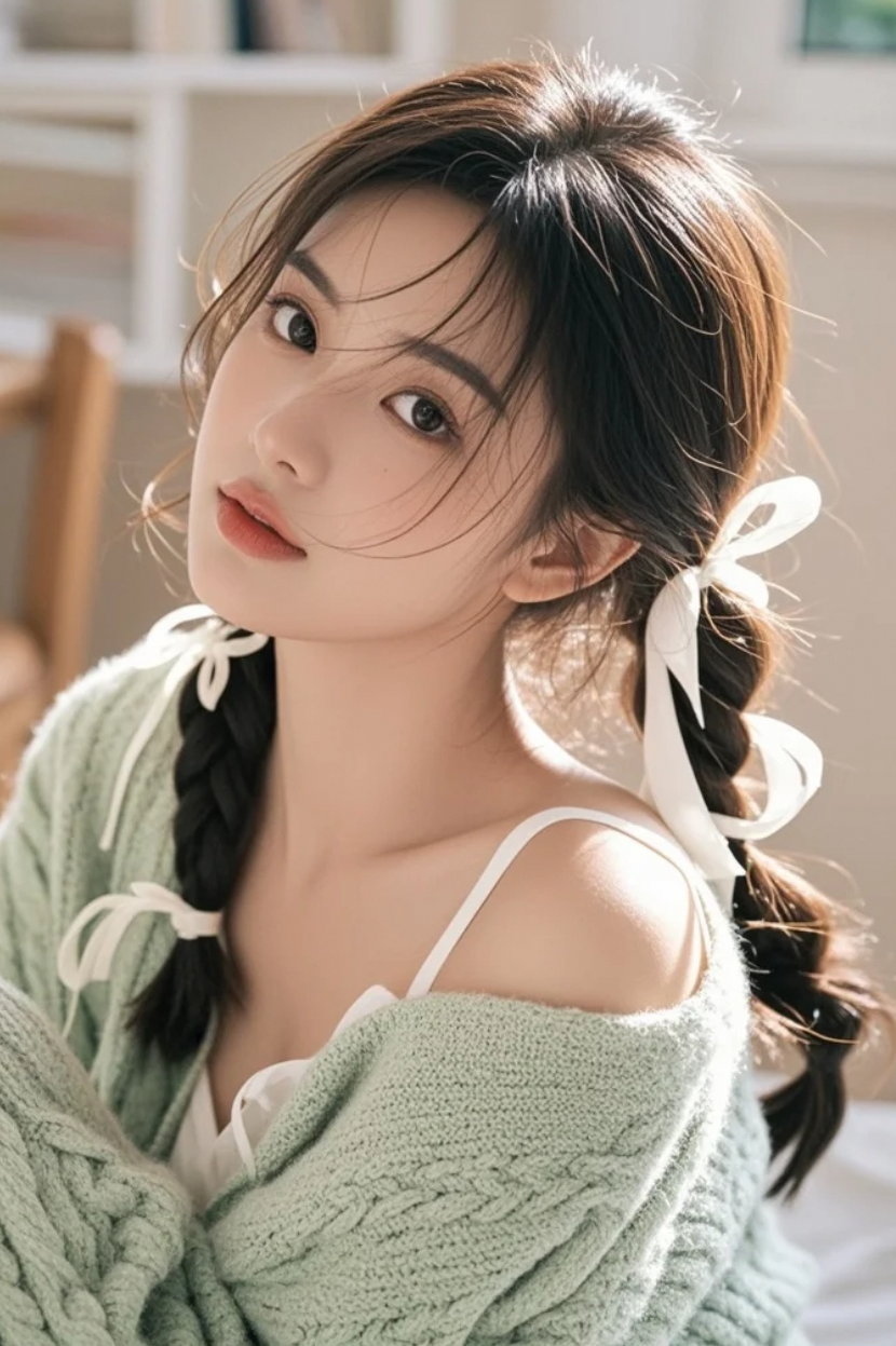 麻花辫+丝带尾梢,她靠在窗边的样子,像极了青春电影的开场