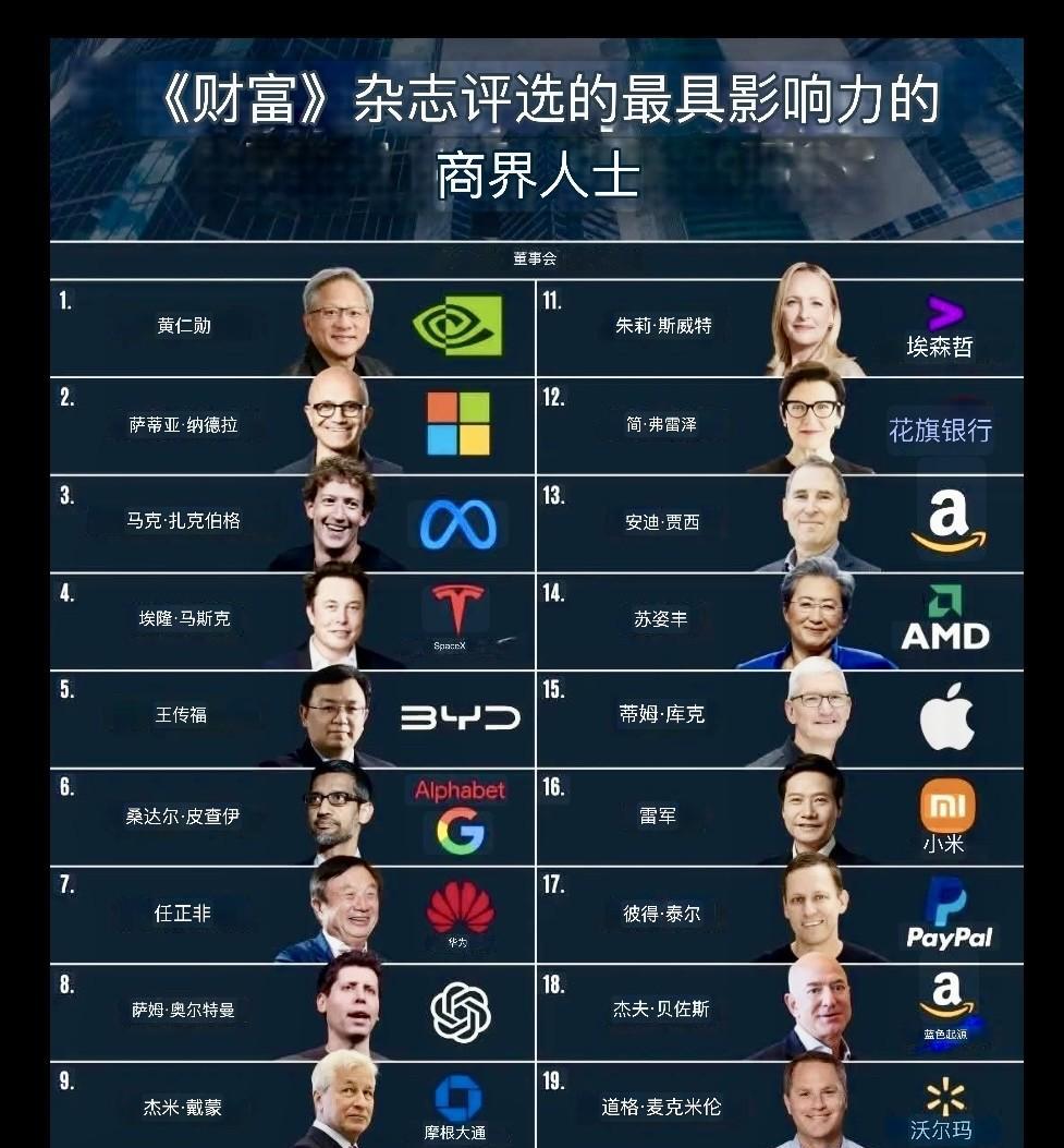 《财富》杂志评选的最具影响力的商界人士: 《财富》商界最具影响力人物榜单,几乎全是科技人物。例如*黄仁勋(Nvidia)、*纳德拉(微软)、*祖克柏(Meta)与*马斯克(Tesla),其中也包括中国的*王传福(比亚迪)、*任正非(华为)与*雷军(小米)…… 这些人不仅掌握企业营运,更透过技术平台与资本配置,影响市场趋势与国际产业链格局,新的生产力周期,也围绕着这些人展开。