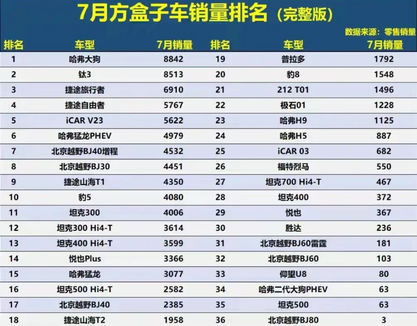 7月方盒子销量: 长城的总销量约33600台 奇瑞的总销量约25200台 比亚迪