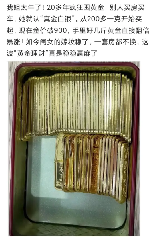 黄金卖不动骗你们去买了。别人买房享受了大半辈子,你囤黄金存铁盒子,一直住破房子,闺女加了黄金带给之前买房的人。所以该买什么清楚吧