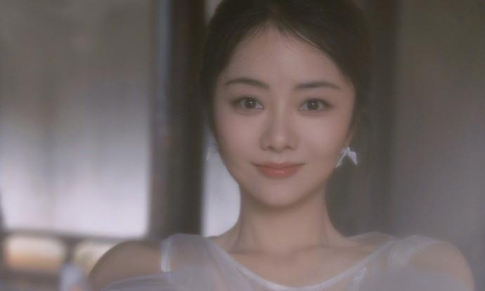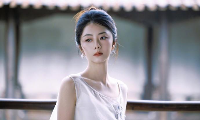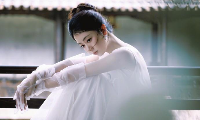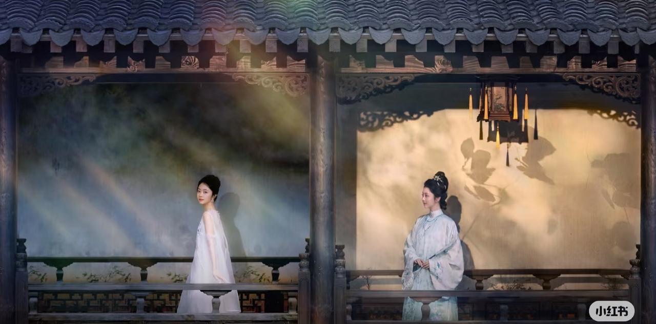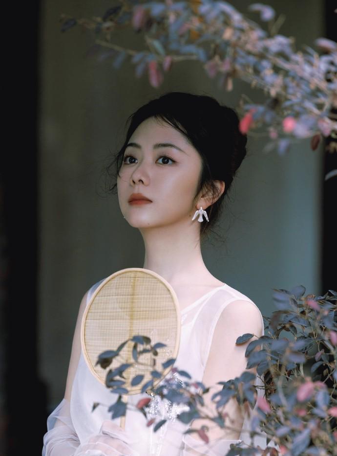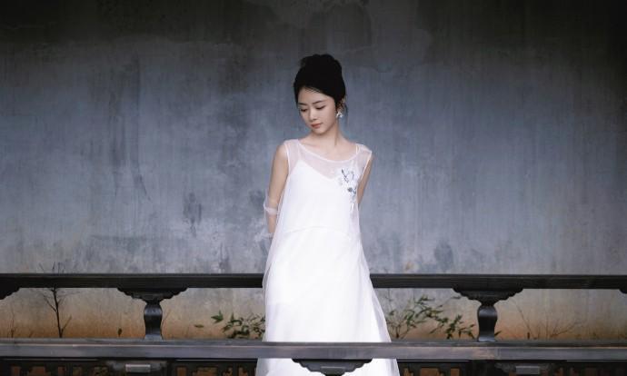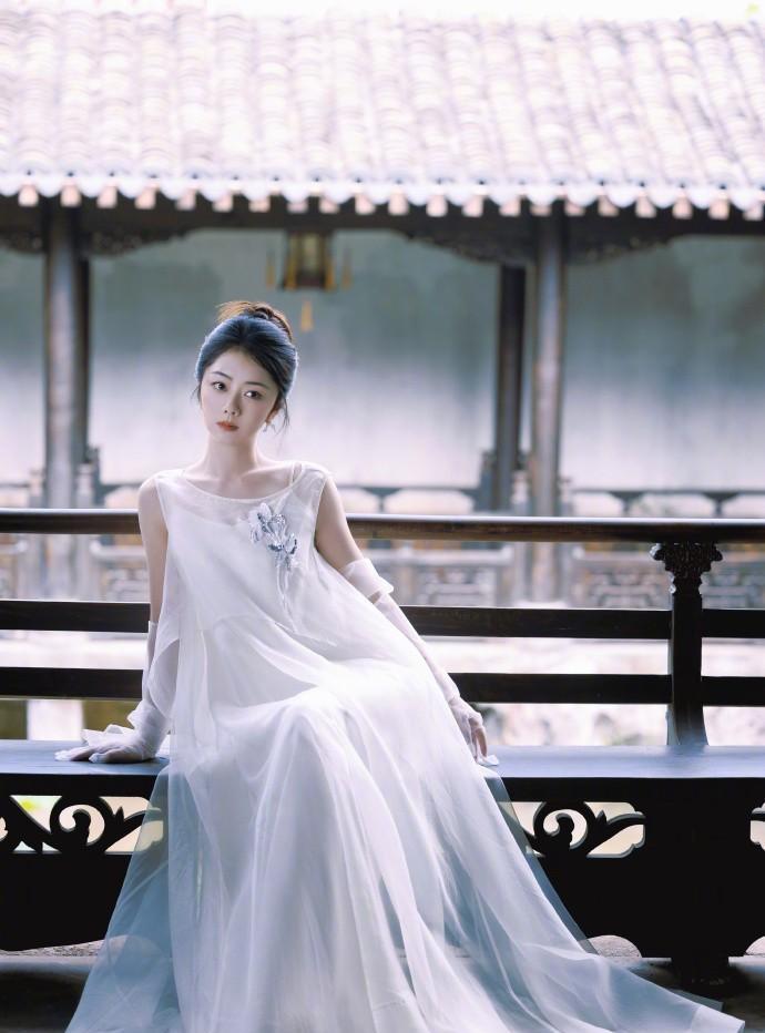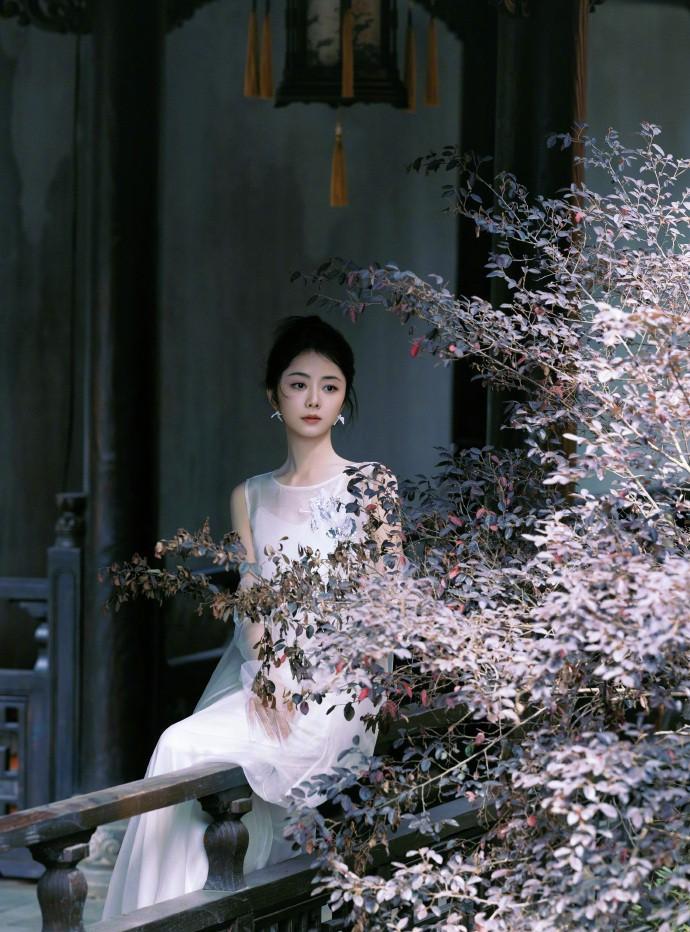青砖黛瓦,谭松韵身穿无袖白纱裙,在古色古香的40亩小园林里幽歩,仿佛看到两小姐与