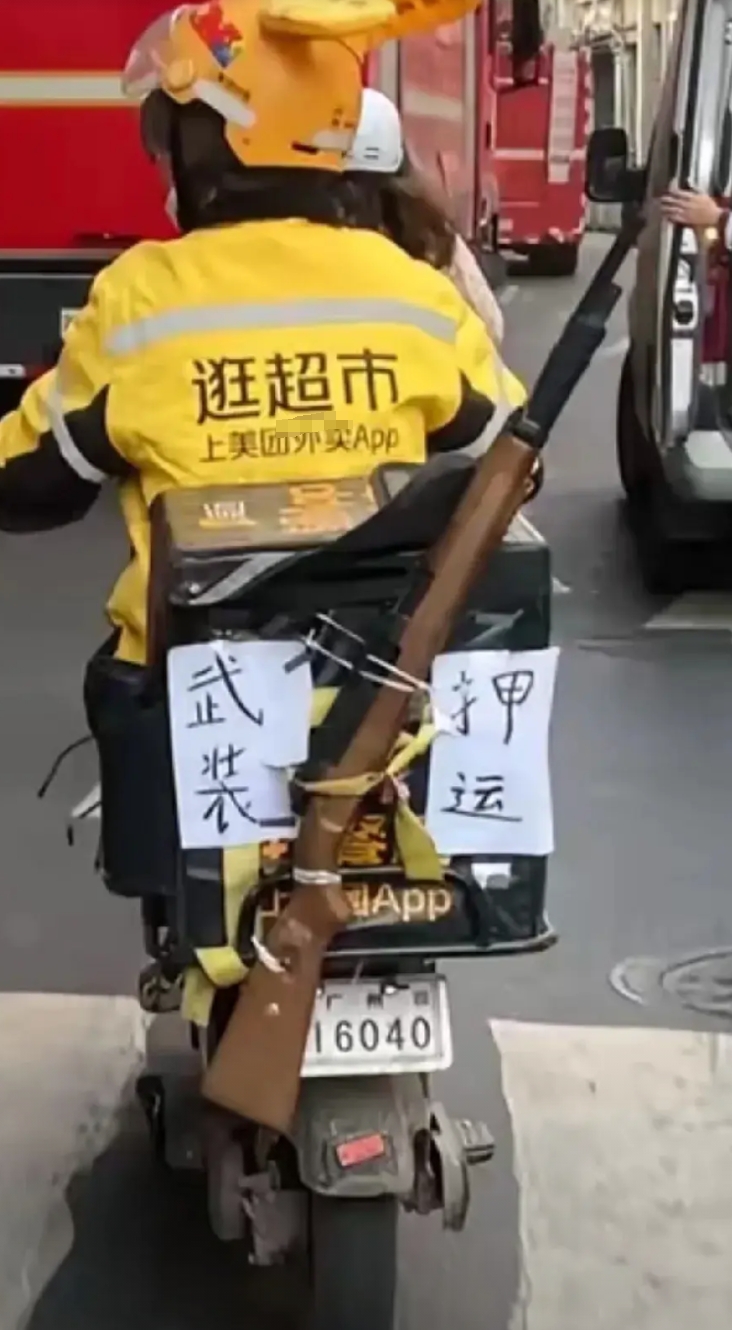 “彻底解释不清了”广东广州,有一名女外卖员为了防止自己的餐箱的外卖被人偷走,特意买来一把塑胶玩具枪挂在外卖箱上,并且在外卖箱上贴着一张纸,纸上写着武装押运。