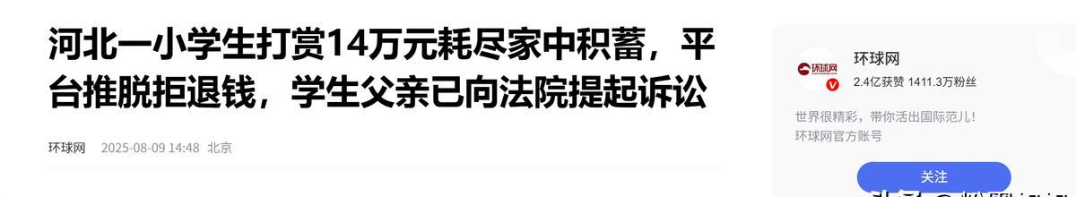 “胆子不是一般大!”河北保定,一小学女孩因在班级受到同学冷落,就想到虚拟世界寻求安慰,短短5个月,女孩就在交友软件打赏了14万元,耗尽家中积蓄,父母得知后,联系平台退钱,没想到,竟遭到对方各种推脱,气的女孩父亲将其告上法庭! 河北保定的陈正怎么也没想到,自己银行卡里的 14 万血汗钱,会被六年级的女儿小倩在短短五个月里,全砸进了一个叫 “觅光” 的交友软件,这事儿说起来实在让人咋舌,一个 12 岁的小姑娘胆子咋就这么大呢? 事情得从 2023 年底说起,当时陈正夫妇为了方便小倩上网课,给了她一部手机,谁能料到这个乖巧的优等生,竟悄悄下载了 “觅光”。 一进聊天室她发现只要刷礼物,就能换来满屏的夸赞和热闹,那种被簇拥的感觉,是她在现实中从未有过的,现实里小倩成绩虽好,却总被同学冷落,在虚拟世界里她终于找到了存在感。 小倩很快就着了魔,从几十块到几千块,她像被下了蛊不断充值,最贵的一次,她花 5200 元送了个 “结婚礼”,就为了听主播喊她一声 “宝贝”,看弹幕里齐刷刷的 “666”,她哪知道这每一分钱,都是父母在毛巾厂辛辛苦苦干一个月才挣来的。 2024 年 3 月陈正去给农田水泵充钱,一查银行卡,瞬间懵了,14 万没了只剩 13 元,调取转账记录才发现,钱全进了 “觅光”。 夫妻俩急得团团转,赶紧联系平台,可对方要么推脱,要么干脆失联,无奈之下陈正只能把平台和两家收款公司告上法庭,案子今年 9 月就要开庭了。 要说这事儿平台的责任可不小,一个小学生居然能绕过所有限制,在成人社交软件里随便充钱,既没人脸识别,也没消费预警实名制成了摆设,按照《民法典》,小倩的打赏行为得监护人同意才算数,可平台根本没尽到审核义务,律师说平台要是不整改,还得吃行政处罚。 不过陈正夫妇也有疏忽,手机没设支付密码,青少年模式也没开,这就好比把金库钥匙交给了孩子,更让人揪心的是,他们没察觉到女儿心里的孤独,小倩后来辍学在家,变得沉默寡言这比丢钱更让人心疼。 其实类似的事儿早有先例,北京一个 17 岁女孩打赏 45 万,法院判平台退了 24 万,因为平台审核不严,这次 “觅光” 的情况更严重,连基本的年龄验证都没有。 专家说了平台得加强人脸识别,设打赏冷静期,家长也得升级监管,多陪陪孩子,别让虚拟世界钻了空子。 这场即将到来的庭审,不仅是为了 14 万,更是为了给所有家庭敲响警钟,孩子的成长容不得半点疏忽,平台的责任也容不得半点推脱,希望这次判决,能让 “觅光” 这样的平台真正 “照亮” 责任,而不是成为吞噬孩子未来的黑洞。 (信息来源:环球网——河北一小学生打赏14万元耗尽家中积蓄,平台推脱拒退钱,学生父亲已向法院提起诉讼)