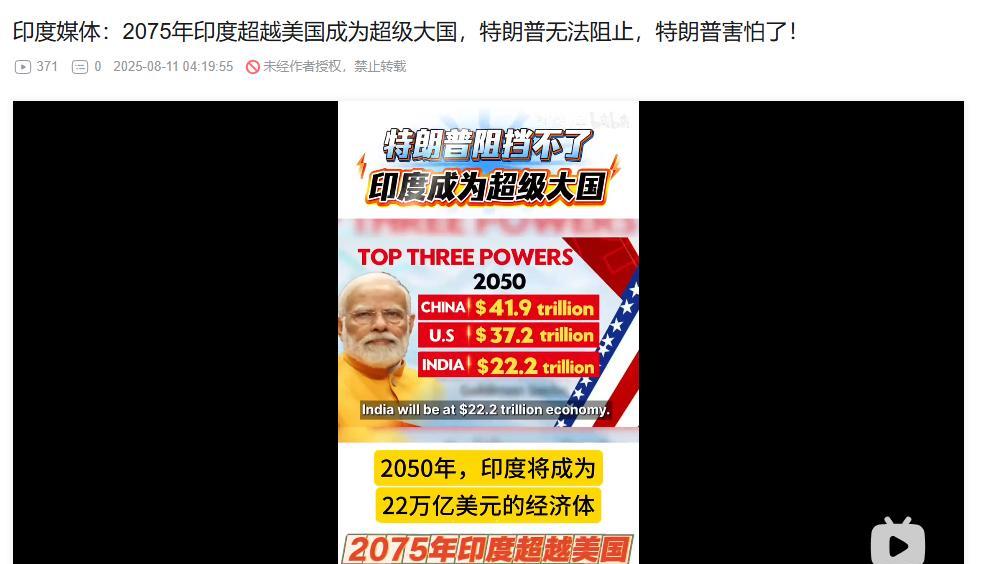 印度主持人:特朗普害怕了,他知道无法阻止印度超越美国成为超级大国。 这是印度著名主持人在节目中的观点,面对美国对印度加关税的事情,他认为,特朗普一天两次谈到印度,是他对印度痴迷的表现,他一会儿对印度痴迷,一会儿沮丧,这让他很绝望。 然后,这哥们还表示,特朗普与其无谓的痴迷印度,不如专注当下,努力去解决美国的债务危机。此外,除了国内问题,美国在全球也遇到很多挑战,老美现在处理不了乌克兰问题,处理不了中东局势,应付不了俄罗斯。正因为老美处理不了这些内忧外患,所以他只能痴迷地想着,怎么样才能榜上印度的大腿。 但印度根本不怕,经过十几年的发展,印度现在非常强大,比英国、俄罗斯都要强大,美国打压不了印度,因为印度现在已经是跟美国、中国一样的世界三大经济体之一。而且,到2050年,印度会成为22万亿美元的经济体,甚至按购买力平价会比中国还要大;到2075年,印度会彻底超越美国,成为当世双强。 正因为如此,特朗普害怕了,面对印度各个层面的领先,他感到绝望,因为他知道无论如何,也撼动不了印度了。 大家觉得,印度主持人的这种观点,是否有理有据?[看][看][看]