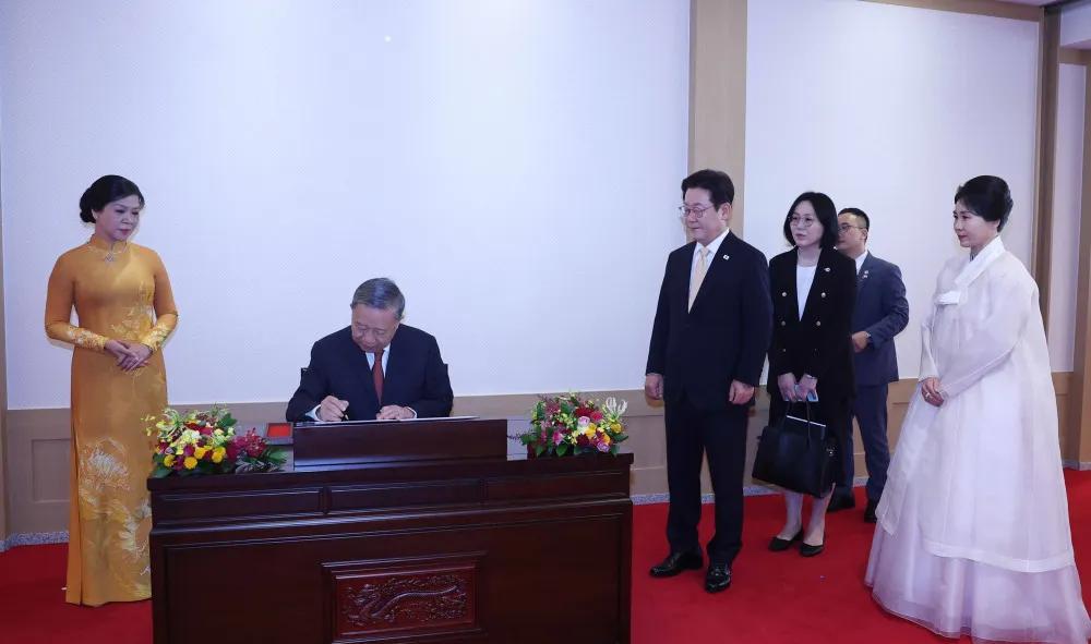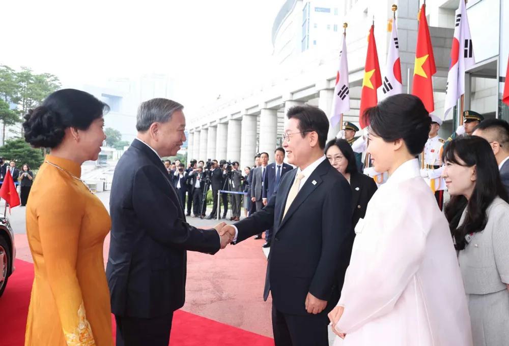 苏林夫人吴璃芳一袭金黄色长裙,丝毫不比李在明夫人逊色! 这次吴璃芳访韩,着装风格跟之前有所不同,以往主要是以典雅和含蓄示人,今天则一改往日形象,用了较为贵气的金黄色调,气场一下子就起来了,而且还不忘以越南的传统服饰奥黛为设计底蕴。不得不说,同为东方国家,越南和韩国的第一夫人也在暗中较劲。