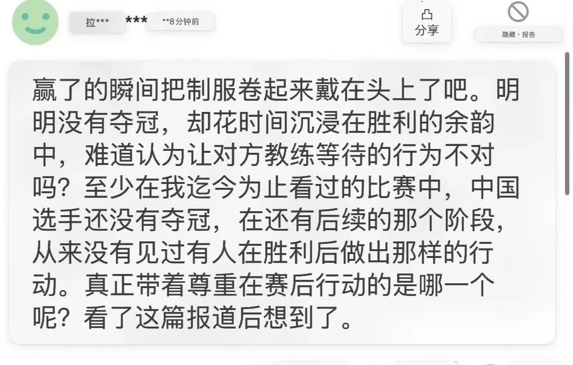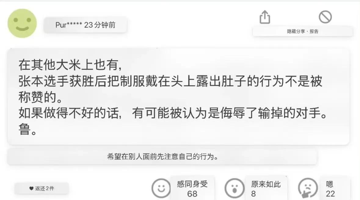 关于张本智和告状,日本人也有自己的主张。 有不少批评中国主教练王皓,认为缺乏体育精神,也有不少认为张本智和自己先反省自己的庆祝行为,有人认为“张本智和明明还没有夺冠,就放肆的庆祝,确实不妥”,有的举例当年梁靖崑庆祝球拍放错了地方都被禁赛一年。 其实本来这件事根本不是个事,如果非要鸡蛋里挑骨头,张本智和绝对有错,比如我要挑张本智和的毛病,他的每场比赛我能挑出至少十处,但是根本没必要公然挑开彼此的颜面。张本智和这次明显是情绪失控。