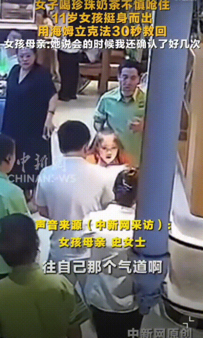 孩子妈妈确定了好几次“你确定你能弄好吗?”,女孩直接上前用了30秒海姆立克法成功将女生救回。