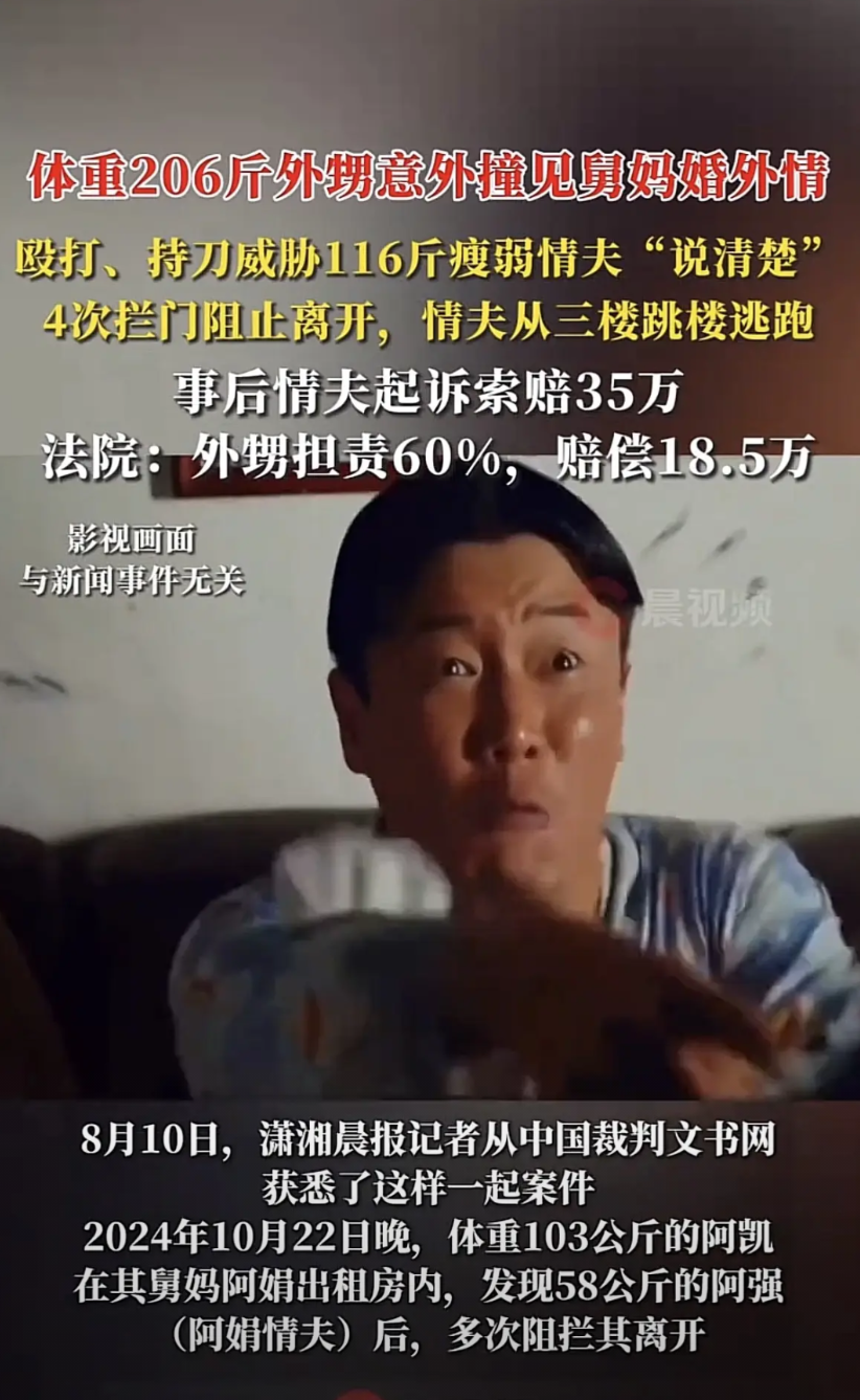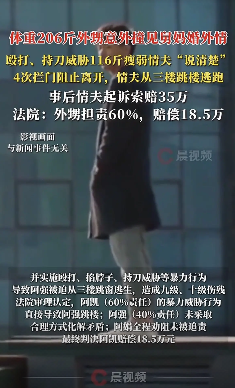 山东枣庄,女子不顾家室,和工地上认识的男子好了,两人在出租屋过夜时,被女子外甥撞见,男子见状想跑,却被外甥持刀拦住,逼问他俩是什么关系,还把男子揍了一顿,被拦4次后,男子实在没辙,从3楼窗户跳下去逃跑,结果摔成多处骨折,颅脑损伤。事后,男子把女子和外甥告上法庭,索赔35万,法院判决让外甥无法接受。