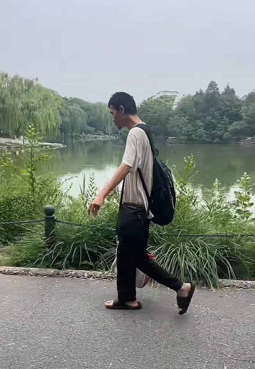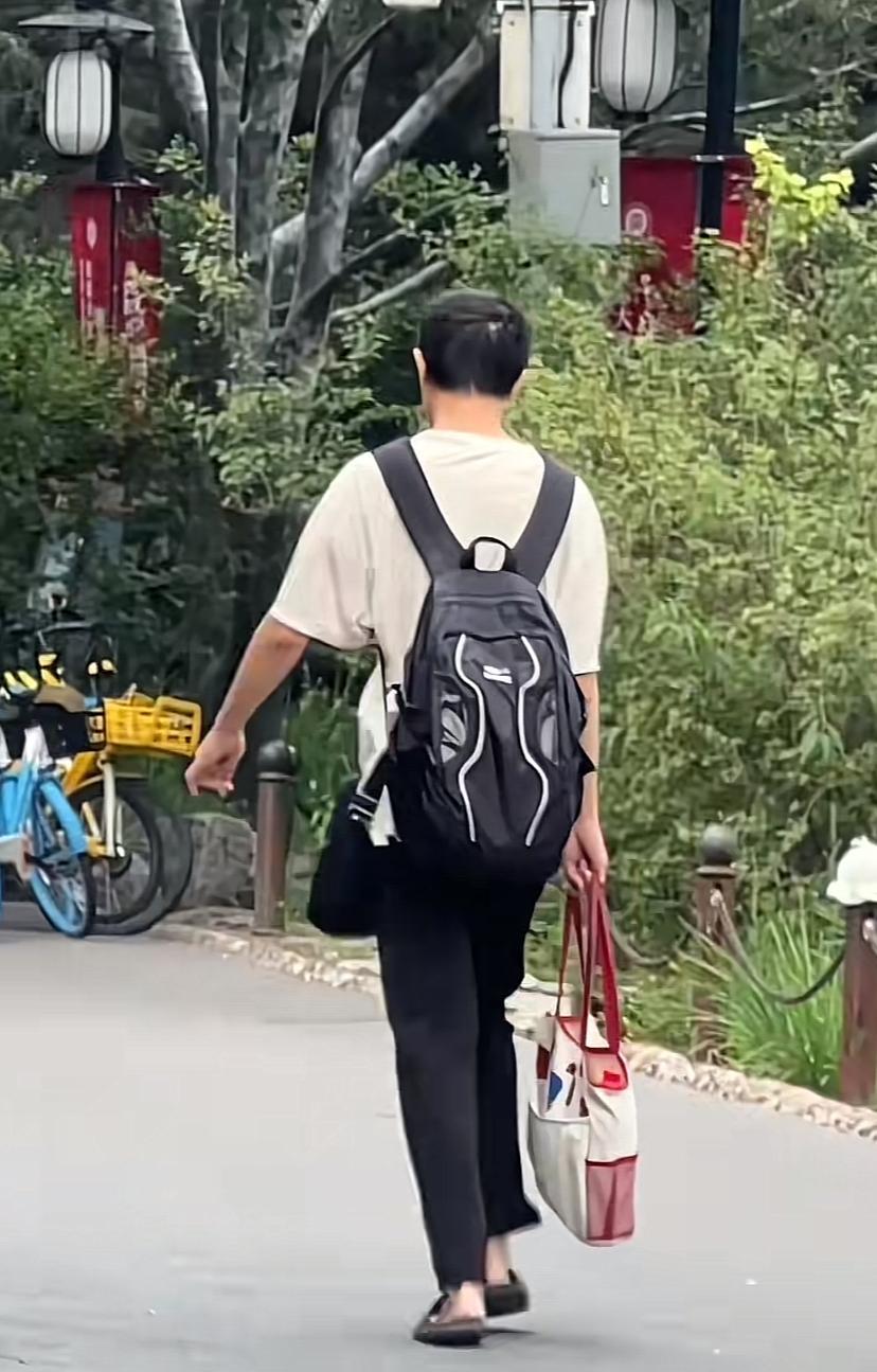 同学又碰到韦神了,这次在一个湖边,穿着大拖鞋,走得特匆忙,身上背个包,前面挎个包,还拿个袋。听说韦神可能不会骑自行车,走路姿势也有点别扭,速度特快。北京正是热的时候,建议学学自行车吧,别人都是骑车,大城市步行费劲,要么换个拉杆箱。