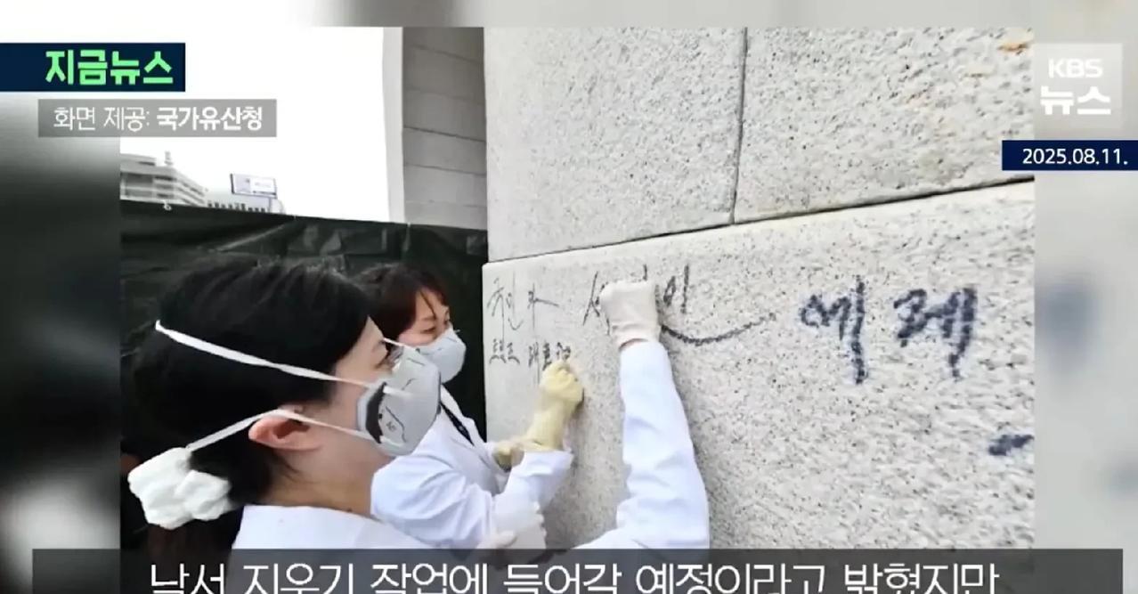 韩国景福宫再现非法涂鸦行为,韩国极右翼人士在景福宫光化门石筑上写道:"献给国民和