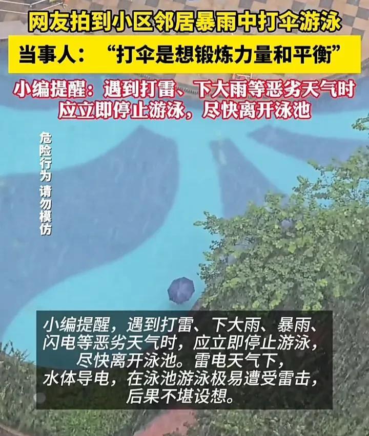 真是不要命了!近日,四川一位网友发视频称,下暴雨的时候,小区有一位邻居居然在泳池里打着伞游泳,虽然是独享整个泳池,但感觉非常危险。