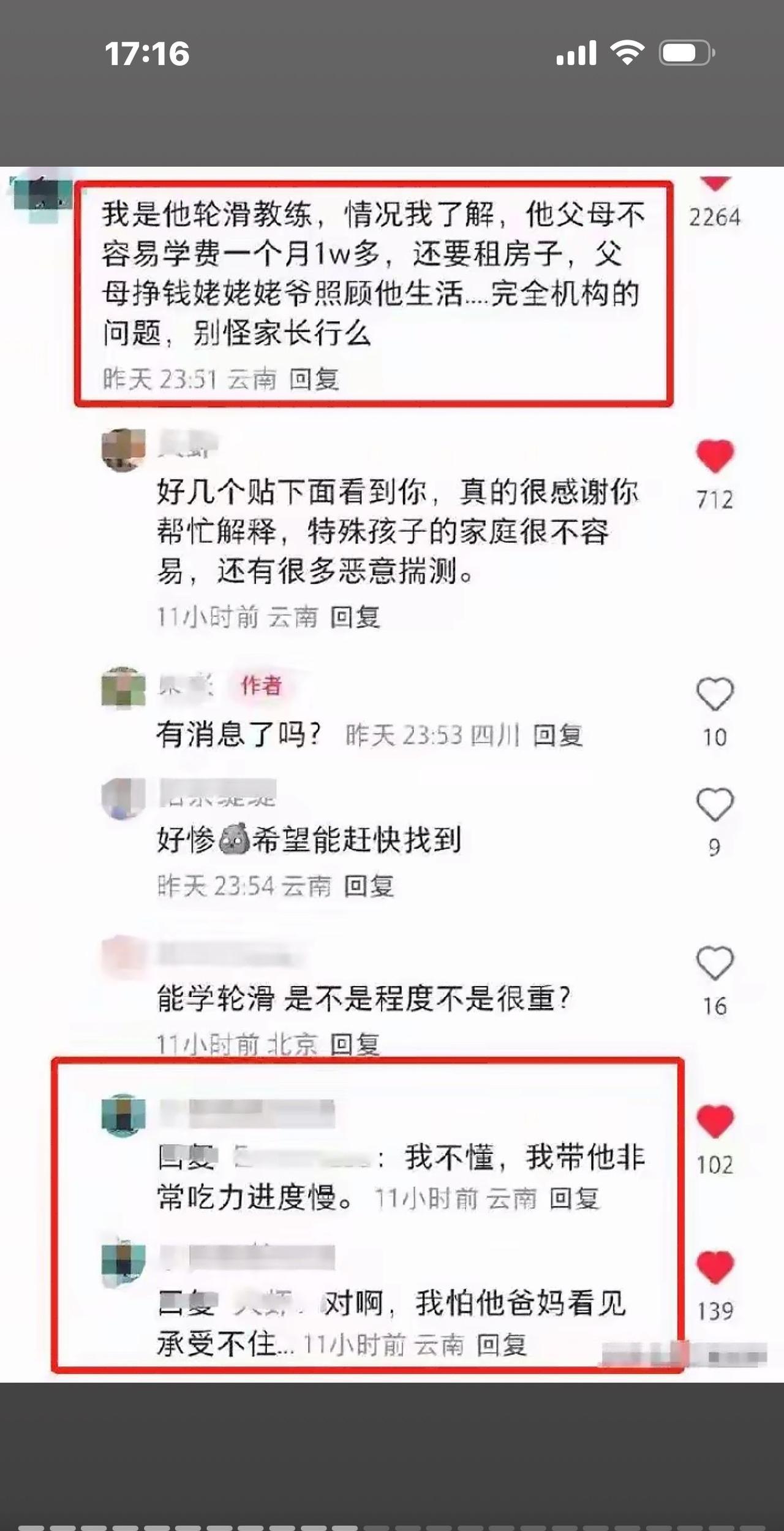 自闭症男童王一铠,今天还没消息,有人说,他跑下大马路,混入人流中也有可能。 因为他走丢的地方离下山不远,也有可能他下山,跑去大马路上了。 轮滑教练说,王一铠学轮滑非常吃力,进度很慢很慢。虽然王一铠学轮滑慢,但是运动天赋极强,一不注意就跑了。 王一铠父母和轮滑教练的聊天记录表示,儿子很怕热,很少主动表达,一般只在问询的时候回答一句,而且一热起来就特别烦躁。 估计那天王一铠和夏令营的老师上苍山,也是趁老师不留神,瞬间就跑掉了,郊外旷野,太自由自在了,因为自闭症的孩子,看见山越陡峭越喜欢去攀爬,看见水就想一个猛子扎进去,这好像是他的本能反应一样,孤独症的孩子对危险意识一点也不敏感,所以没有大人照看, 特别容易出事。 王一铠的父母在北京也不易,要租房子,每个月舍得出1万块钱让儿子上特殊幼儿园,还是把他当宝贝养的。两口子在外挣钱,并托父母照顾孩子的饮食起居,以为这样安排妥当就没事,没想到,好不容易,孩子有惊无险带了七八年,最后却去夏令营机构登山失踪。 网上还有另一位妈妈说,她也有一个孩子患了这种病,所以比较了解自闭症儿童,这种孩子是很怕走丢的,主动走失或逃跑的可能性比较小,很有可能,孩子已经出事了,遭遇了不测,只是老师害怕担责,统一了口径,但是另外同队的六个孩子有可能知道一些情况,不可能统一口径,她建议有关部门分别盘问一下几个老师和6个孩子,或许有别的线索。 大家认为这位妈妈说得有道理吗?