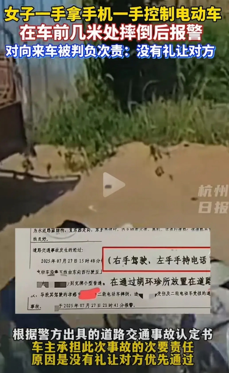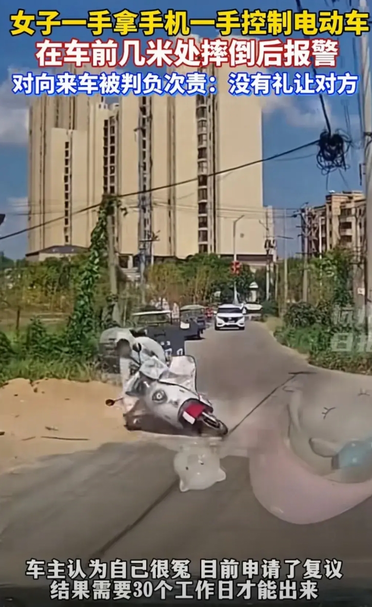 礼让成了“违法”的依据? 一女子骑电动车在距离一辆机动车几米远摔倒在路边一堆沙子