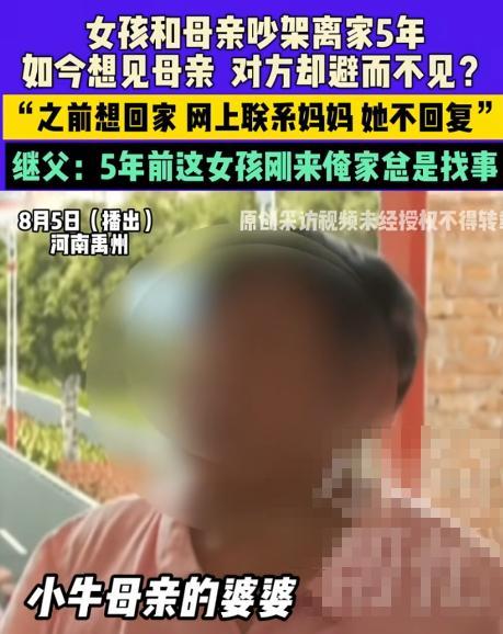 “自作孽不可活!”河南一12岁女孩和妈妈吵架离家出走,5年后想回来找妈妈和解,没想到妈妈却拒绝见面。原来当初女儿干的事,让她至今无法原谅! 2025年8月5日,年仅17岁的小牛坐在媒体的镜头前,哭着说想见母亲一面,但母亲不仅不同意,反而一直拉黑她。 无奈之下,她只好寻求媒体的帮助,让母亲能出来见她。看着泪流满面的小牛,可能许多人都不明白,究竟是什么原因能让一个母亲狠下心不见自己的孩子。 据小牛讲述,自己12岁那年,父母因为感情不和离婚了,由于小牛年龄尚小,法院便将小牛判给了母亲。 没过多久,小牛的母亲就再婚了。起初小牛认为自己在新家庭又体会到父爱和母爱,但让她没想到的是,继父的到来,不仅没有让母女二人之间的感情升温,反而还僵化了两人的感情。 众所周知,青春期的孩子本身就十分的敏感,再加上刚离婚又结婚的母亲。作为小孩的小牛自然无法理解母亲的感受,于是自从母亲再婚后,两人经常吵架。 不过,虽然母女两人经常吵架,但小牛一直没做过什么出格的事情。直到有一次,两人又爆发了争吵,小牛直接摔门离开,并且这一走就再也没有回家。 如今这个社会,一个成年人想要舒心、轻松的生存下来都非常的艰难,更不用说一个年仅12岁的孩子。 并且,小牛要学历没学历,要年龄也不够,为了生存下来,就只能在餐馆当服务员,去美容店当学徒。 经历了这段时光,小牛深深体会了离家出走的日子不好过。但起初,小牛心里的怨气还能支撑着她。 然而,随着时间的推移,没有朋友的关照,没有母亲的安慰,没有家人的陪伴,小牛生活的越来越艰难。 这时的小牛无比希望母亲给自己来一通电话,接自己回家。但她始终没能等到母亲接她回家的电话,终于有一天,小牛终于忍不住,拨通了母亲的电话。 这时,小牛才意识到,母亲早已将她拉黑删除,即使是换号拨打,只要母亲听到是自己的声音,就会秒挂电话。 母亲这样的态度给小牛泼了一盆冷水,她也明白母亲依旧没有原谅她。但思念母亲过度的她依旧不愿放弃,这才有了我们上文中的那一幕,小牛泪流满面的朝媒体哭诉着。 可让所有人都意想不到的是,当记者带着小牛出现在母亲家门口时,母亲冰冷的态度让小牛感到心寒。 母亲不仅不愿亲自出面看望,甚至还让现在的家人告知小牛不要再来找她。可能小牛都没想到,已经5年没见面的母亲,对自己竟然是这样的态度。 便在母亲的家门口大哭起来,这时一位老人从家里走了出来,并说:她交代了让小牛把电话号码留下来,她回头跟小牛联系。 听到这句话,小牛的情绪有一次崩溃了,在家门口大喊:我都没有她的电话,为什么不能把她的电话给我! 看到这一幕,记者才意识,到两人之间的矛盾似乎并不像小牛说的那般,只是简单的吵架。 经过一番了解,这才明白。原来当时小牛的母亲再婚的时候,小牛的爸爸还有爷爷奶奶知道小牛一直跟着母亲住,便挑唆小牛在母亲现在的家里挑事,试图把这家人的生活搅得不得安宁。 当记者询问小牛的继父,究竟是怎样挑事的时候,小牛的继父却说道:具体找啥事儿我不知道。 无奈之下,记者只好带着小牛找到村委会,希望能从这里获得跟小牛母亲联系的方式。但让记者没想到的是,小牛的母亲甚至已经跟村委会的工作人员打好招呼,不让他们告知自己的联系方式。 最重要的是,小牛的母亲已经明确的告知他们,不想跟小牛再有任何的联系。 村委会的这句话一出,让小牛好不容易平复的性情又一次激动起来,哭着说:我真没想到她会这样! 当小牛的事件被传到网上后,引起了不少网友的讨论。 有的网友以身现法的说到:我也是当妈的,孩子今年高一,一般刷到孩子叛逆都是共情到父母,这个我真的一点儿也不站她妈妈。孩子即使有再不对到地方打骂都行,才12岁刚小学毕业的女孩,是怎么能眼睁睁的放任孩子离家出走不闻不问的。 还有网友为小牛打抱不平:你们仔细看,父母离婚时孩子才11岁,两个家长拿孩子当工具人互相伤害,孩子才是最可怜的,况且现在她仍然未成年,但凡有良知的父母做不成这种事。 更有网友直接了当的说到:听亲爸爷奶的挑唆你就来找事,伤了母亲的心,长大了知道妈妈的好了。许多父亲爷奶拢络孩子,并不是爱孩子,而是让孩子站队。事实证明你父亲那边亲戚不咋地,要不不会让你小小年纪颠沛流离。 参考资料:
