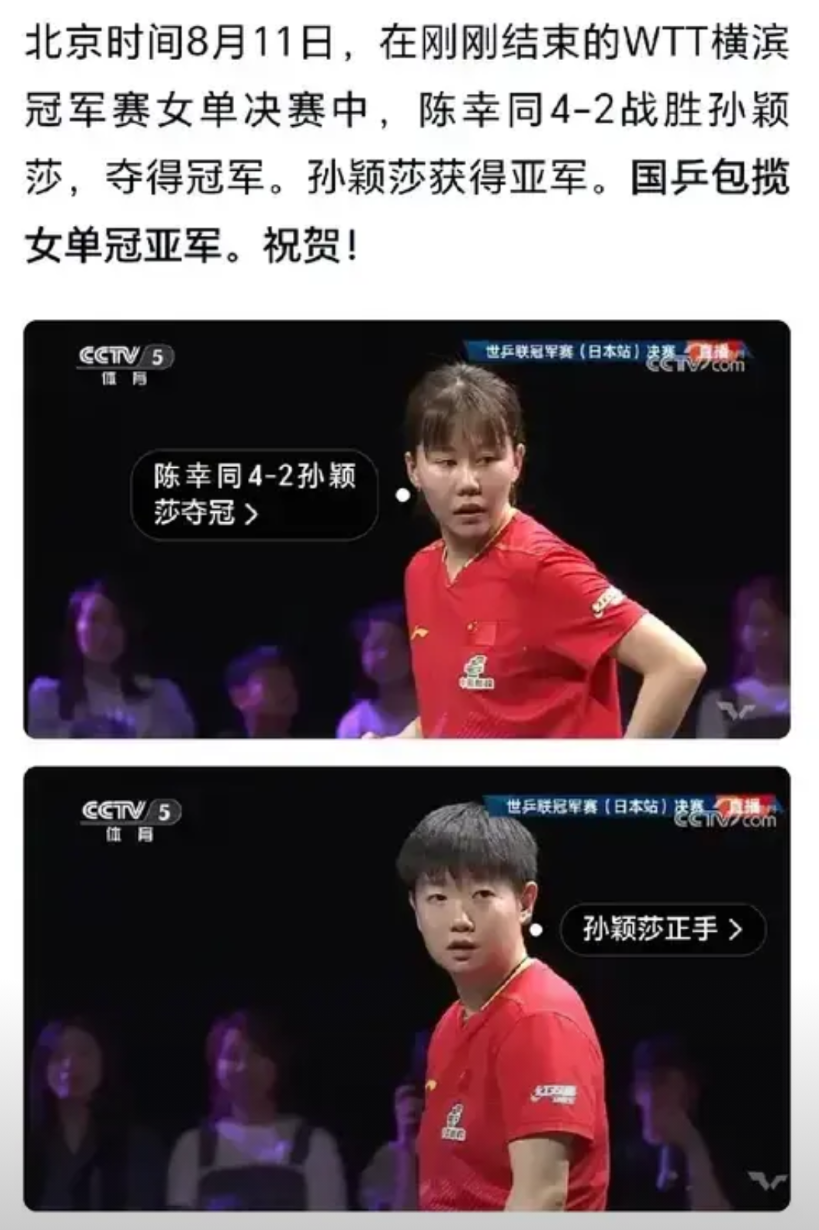 陈幸同夺冠了,众望所归! 具有大将风范的陈幸同,很多次比赛都甘当人梯,勇作排雷英雄,默默为队友夺冠率先清障。这次陈幸同通过自己的不懈努力,终于也享受到了冠军滋味。 当然,除了陈幸同能打到决赛是关键之外,也有小魔王孙颖莎的原因。明眼人都能看到莎莎在这场比赛中没有强烈的求胜欲,全场少有正手突击,更多使用反手击球就是明证。 孙颖莎连续打掉小本子后,身体累了,心理也放松了,作为懂得基本人情世故的孙颖莎,她在保证集体利益和国家荣誉不受到损害的情况下,还能够兼顾队友的感受,真的了不起。 反正她自己已经有很多个冠军了,多一个少一个无所谓,而陈幸同却需要一个冠军来证明她这个“世三”的价值了。 这次善解人意的莎莎意外输掉这场决赛,却使陈幸同职业生涯也戴上冠军的光环,这为今后大家在大赛中为国乒再创辉煌更为有利。祝贺陈幸同!