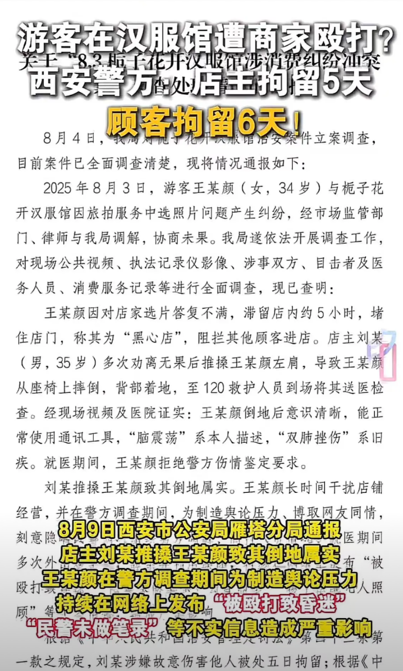 她不光报了警,还将这件事情公布网络,说自己因为倒地脑震荡,还有双肺挫伤等症状。网友们也表示同情和愤怒,同开始对网暴那家汉服店和当地文旅施压。一时间啊,大家都觉得这是“黑心商店”对老百姓单方面欺压。