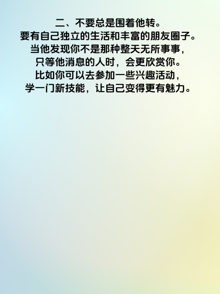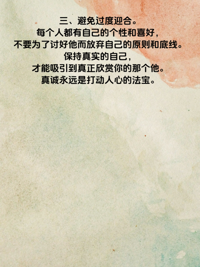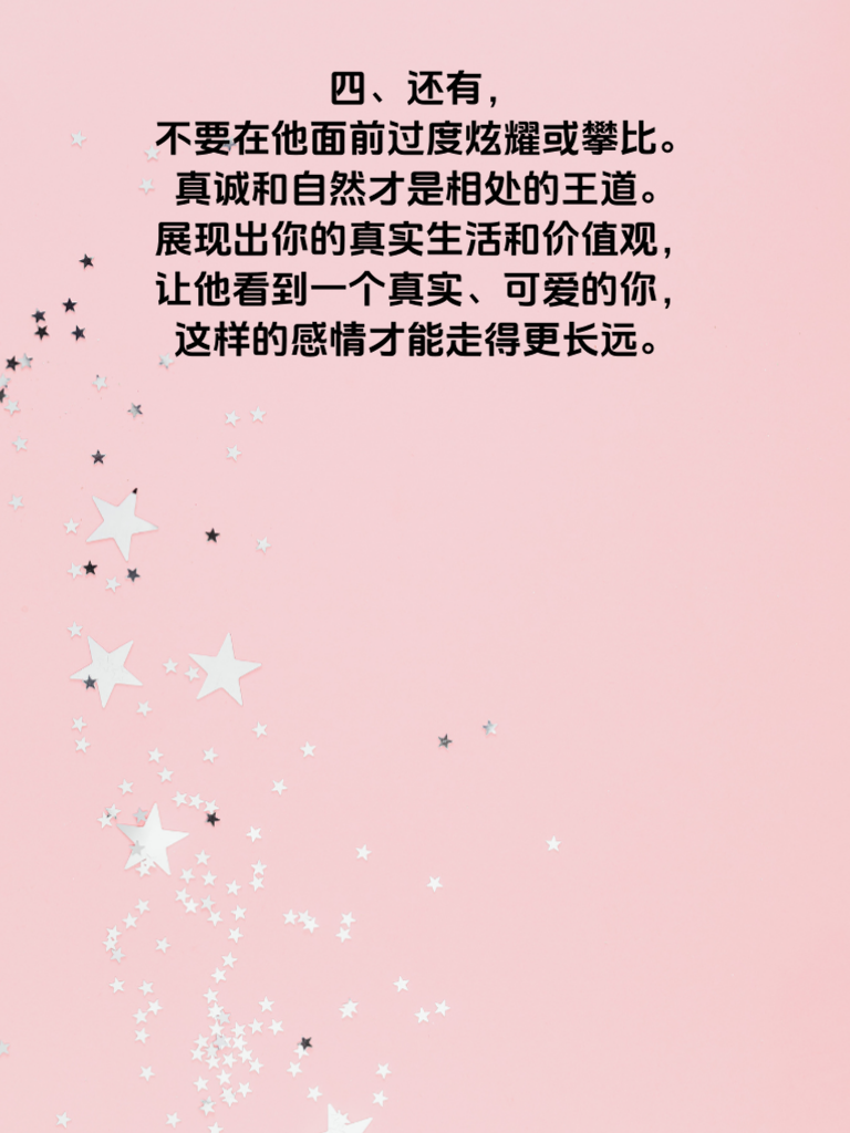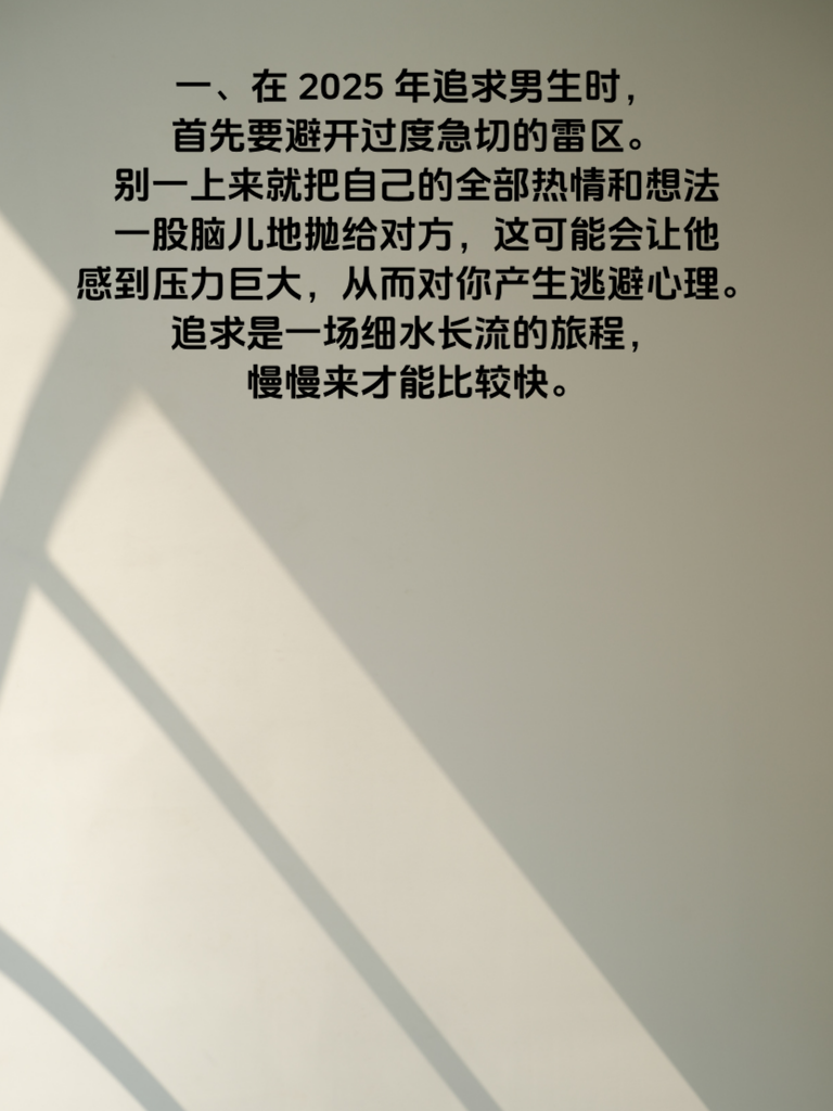 一、在 2025 年追求男生时,首先要避开过度急切的雷区。别一上来就把自己的全部热情和想法一股脑儿地抛给对方,这可能会让他感到压力巨大,从而对你产生逃避心理。追求是一场细水长流的旅程,慢慢来才能比较快。 二、不要总是围着他转。要有自己独立的生活和丰富的朋友圈子。当他发现你不是那种整天无所事事只等他消息的人时,会更欣赏你。比如你可以去参加一些兴趣活动,学一门新技能,让自己变得更有魅力。 三、避免过度迎合。每个人都有自己的个性和喜好,不要为了讨好他而放弃自己的原则和底线。保持真实的自己,才能吸引到真正欣赏你的那个他。真诚永远是打动人心的法宝。 四、还有,不要在他面前过度炫耀或攀比。真诚和自然才是相处的王道。展现出你的真实生活和价值观,让他看到一个真实、可爱的你,这样的感情才能走得更长远。