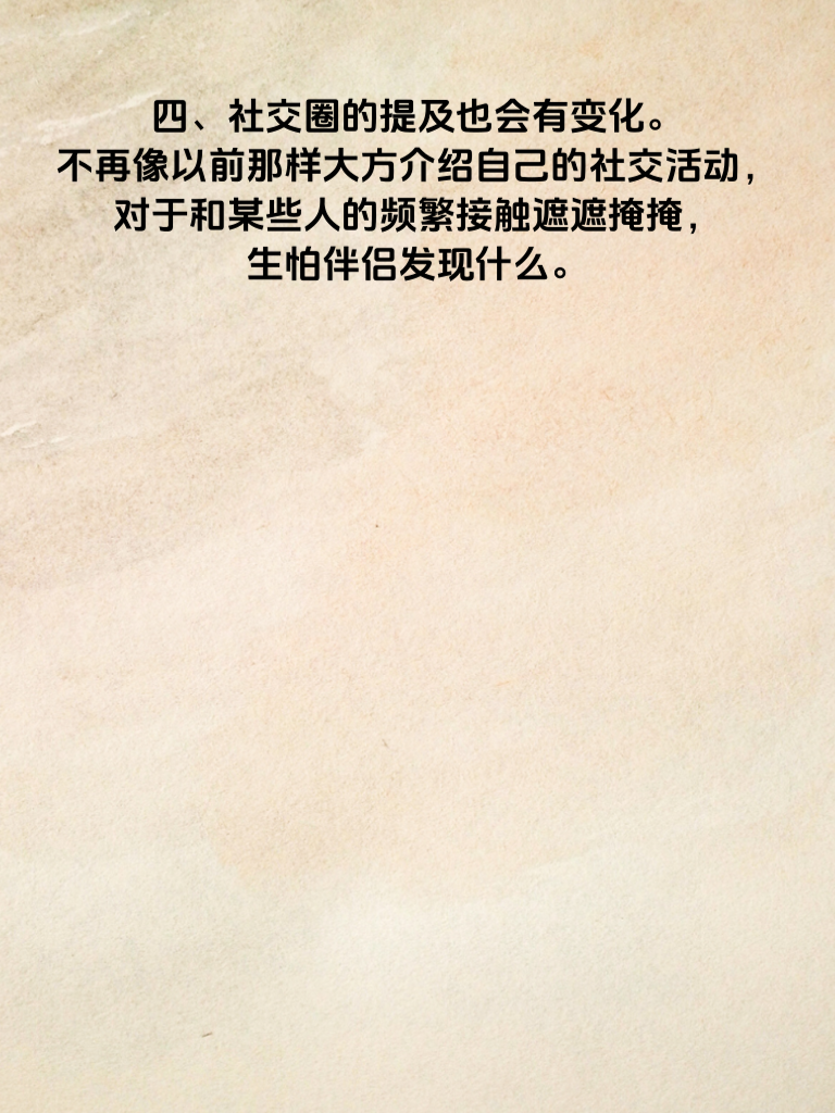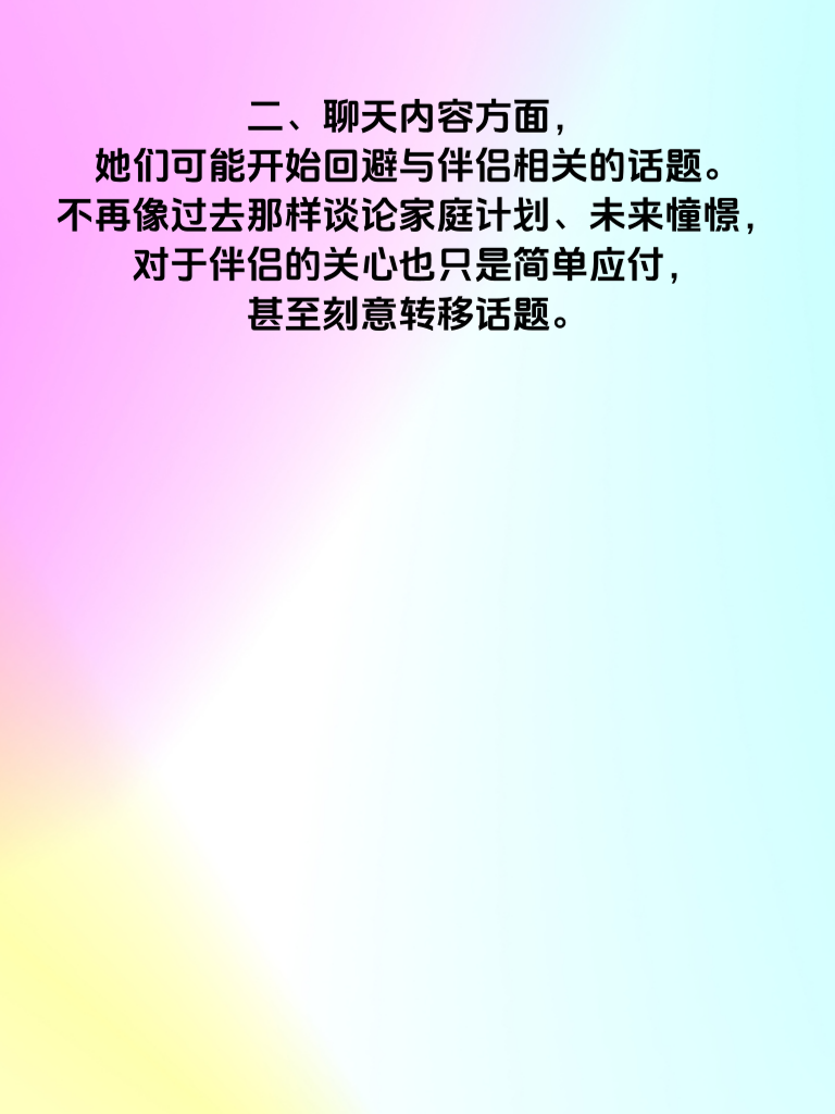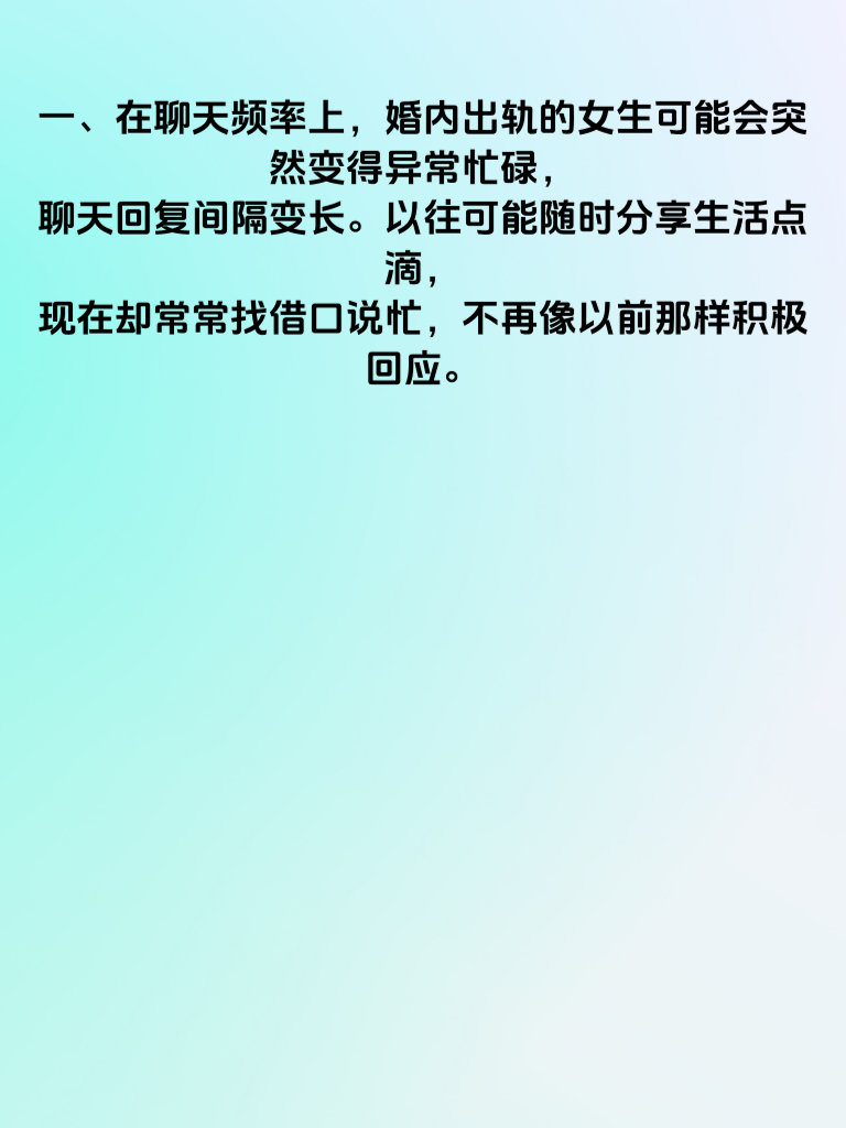 一、在聊天频率上,婚内出轨的女生可能会突然变得异常忙碌,聊天回复间隔变长。以往可能随时分享生活点滴,现在却常常找借口说忙,不再像以前那样积极回应。 二、聊天内容方面,她们可能开始回避与伴侣相关的话题。不再像过去那样谈论家庭计划、未来憧憬,对于伴侣的关心也只是简单应付,甚至刻意转移话题。 三、情绪表达上,会出现较大波动。时而莫名烦躁,对伴侣的话不耐烦;时而又过度热情,与平常的情绪状态差异明显。 四、社交圈的提及也会有变化。不再像以前那样大方介绍自己的社交活动,对于和某些人的频繁接触遮遮掩掩,生怕伴侣发现什么。 五、对伴侣的态度也会转变。不再像以往那样依赖和亲密,可能会减少主动的关心,甚至在言语中不自觉流露出对他人的欣赏,与对伴侣的态度形成鲜明对比。