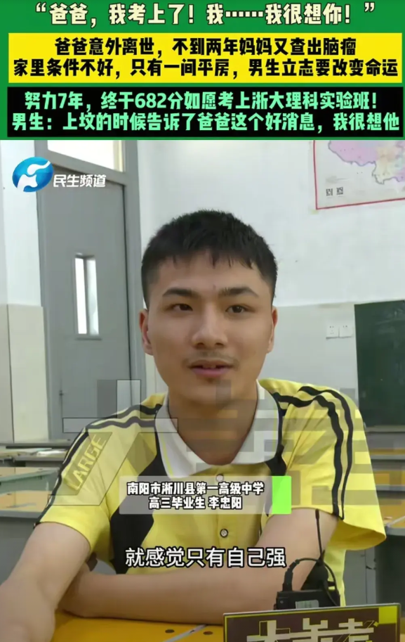 “是个狠人!”河南一男生平时学习成绩垫底,谁料到,他的父亲突然遭遇了车祸去世,母亲也患上脑瘤,面对突如其来的变故,男孩瞬间成长,决心通过学习改变命运,于是,他从此对自己狠下了决心,网友:穷人家的孩子早当家。 据大参考报道:河南一男生原本成绩在班级排倒数,可是面对突如其来的家庭变故,让男孩从此一蹶清醒。 正上五年级的河南男生李忠阳,在中秋节的时候,父亲不幸遭遇车祸逝世,两年后,母亲又确诊患上了脑瘤,母亲每天以泪洗面,四处求人。 面对家庭的突遭变故,李忠阳明白,这个家以后得靠他一个人支撑起来了,他暗自发誓,一定要通过学习改变命运。 据男孩说,学习是他唯一的出路,也是对他来说最轻松的一条路了。 在此期间,李忠阳每天给自己规定不一样的学习计划,每天除了上厕所,几乎都在学习了,十年如一日。 终于,功夫不负有心人,男孩今年以682分的成绩,考上了浙江大学理科实验班。 看了这个男生的故事,心里挺有感触的,这种例子堪称励志典范,从小学班级倒数到考进浙大,这可不是简简单单的努努力就能做到的,背后藏着的是一股子“不认命”的劲儿。 家庭的变故成了他人生的转折点,把学习当做唯一的出路,听起来有点沉重,却透露着男孩的清醒,直到自己的人生只有这条路可以走了,便用余生跟它死磕到底了。 有网友觉得:天赋大于努力,但是我觉得,当一个人把所有的力气都用到一处使,天赋反而是锦上添花的东西。 对于这位考生不与命运同流合污,而是通过自身的努力,战胜命运,大家对此有什么感受吗?