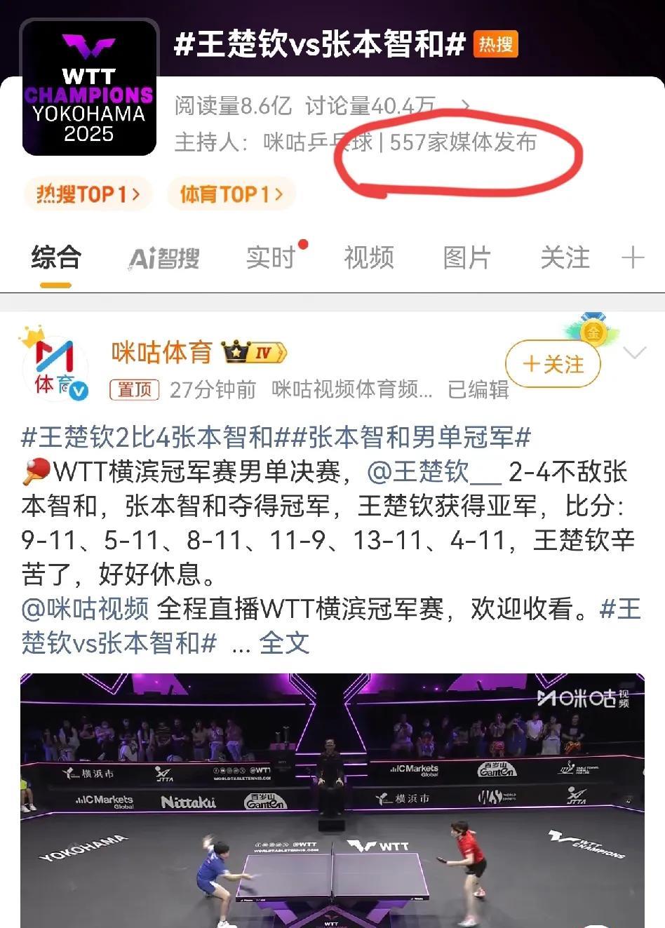 王楚钦败给张本智和,热搜爆了!557家媒体跟进,比之前的208家媒体翻了一倍。头